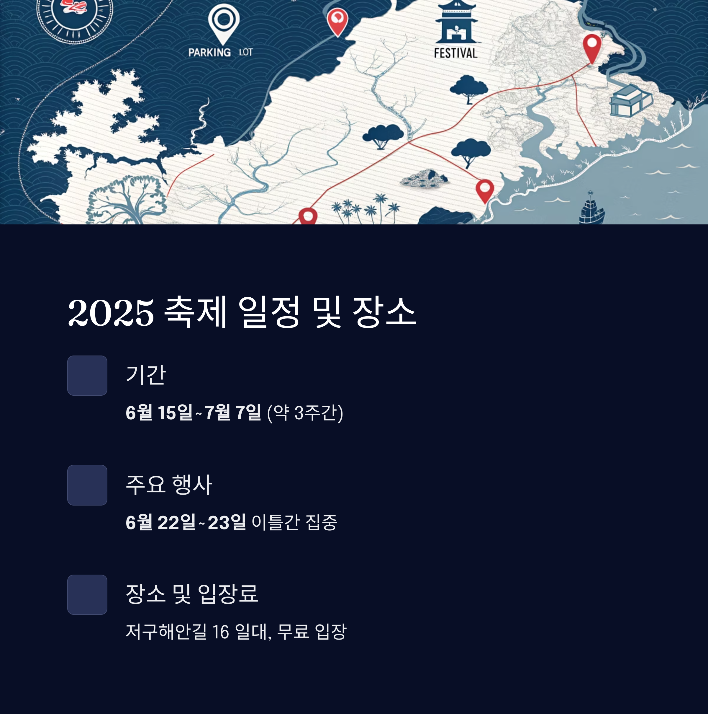 주요 행사는 6월 22일과 23일 이틀간 집중되며, 장소는 저구해안길 16 일대와 마을 도로변입니다.