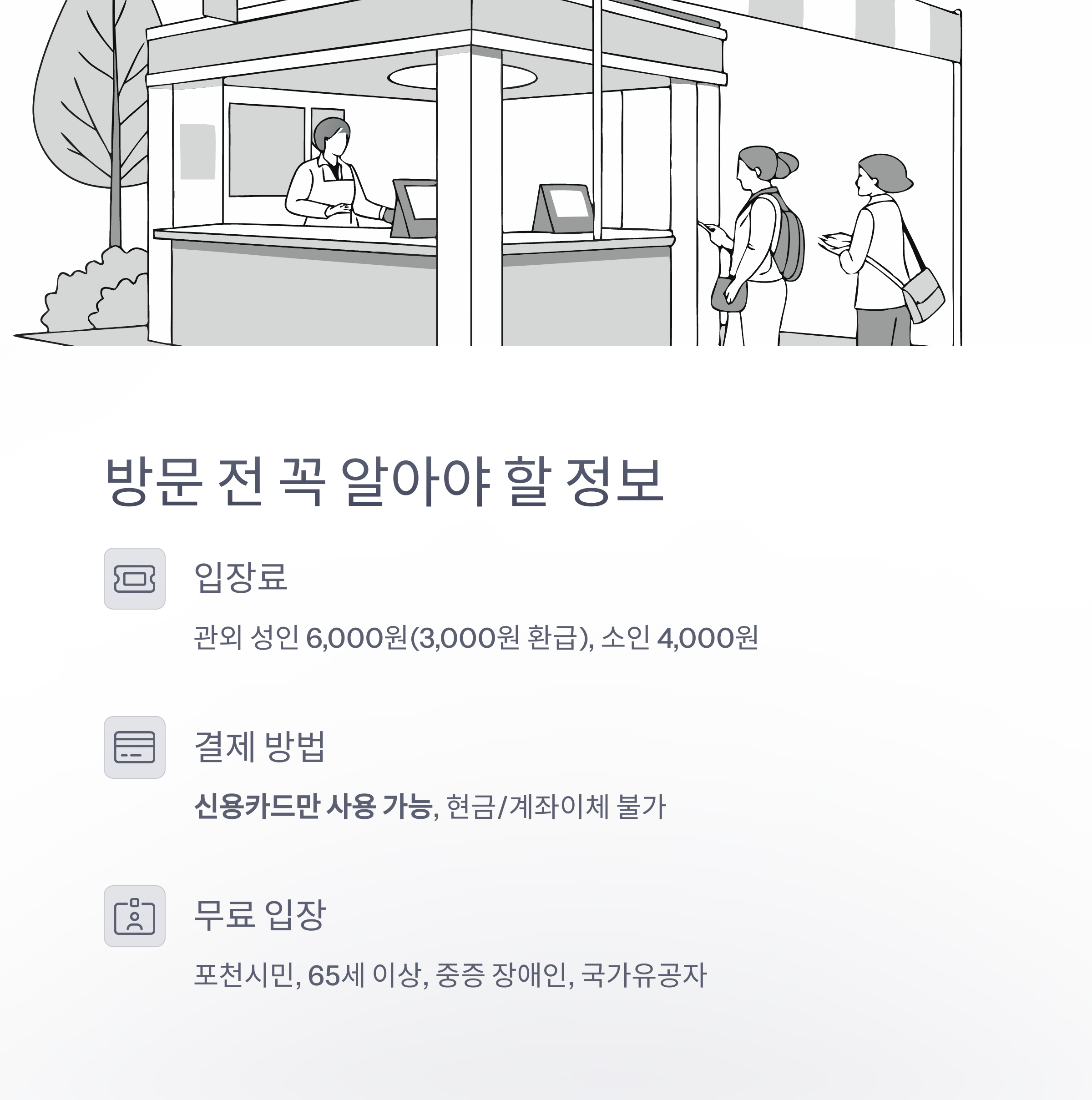 - 관외 성인은 6,000원(포천사랑상품권 3,000원 환급), 소인은 4,000원입니다.