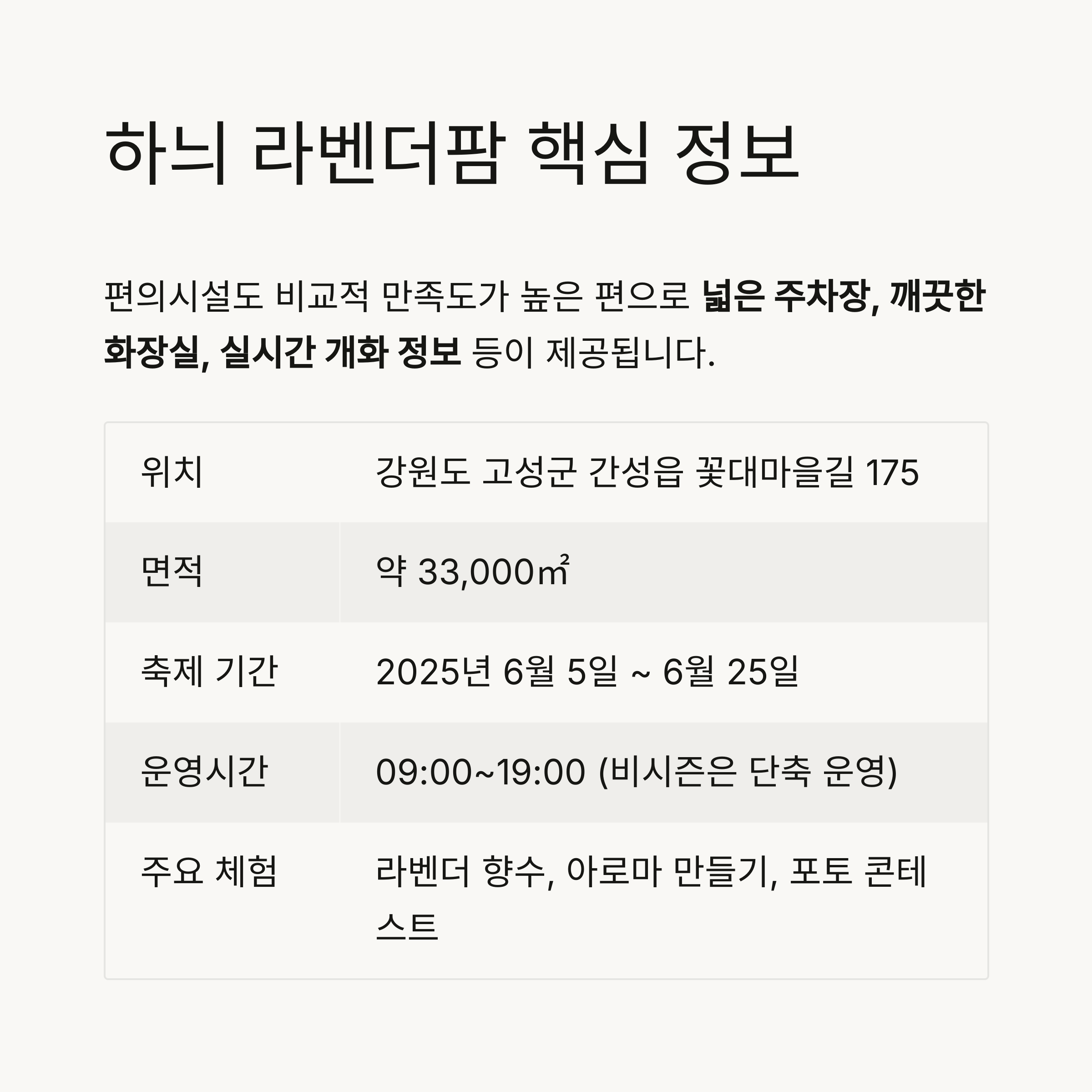 | 이벤트 | 음악회, 라벤더 재배법 소개, 포토 콘테스트 등 다양한 현장 이벤트 |