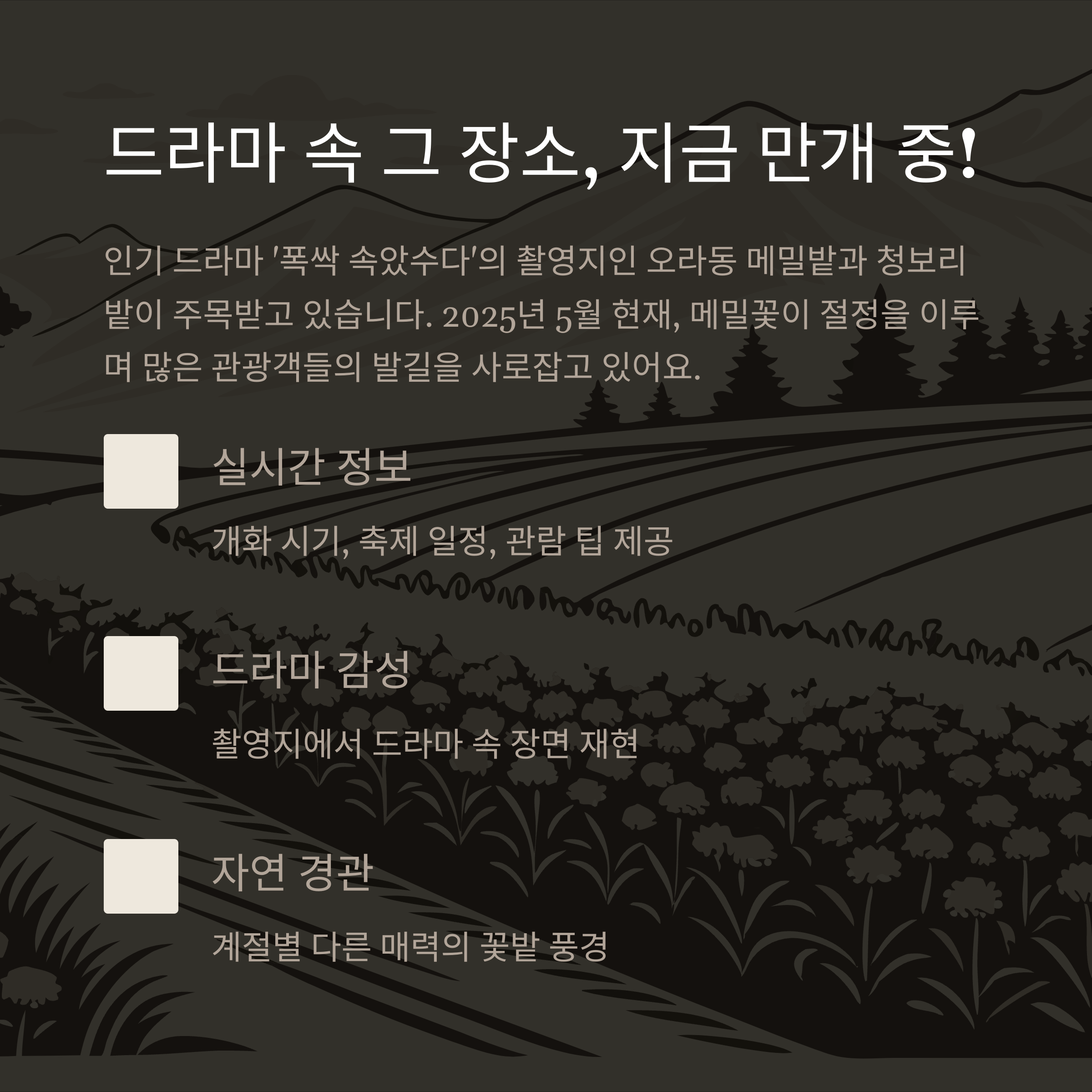 특히 2025년 5월 현재, 메밀꽃이 만개하며 많은 관광객들의 발걸음을 사로잡고 있습니다.