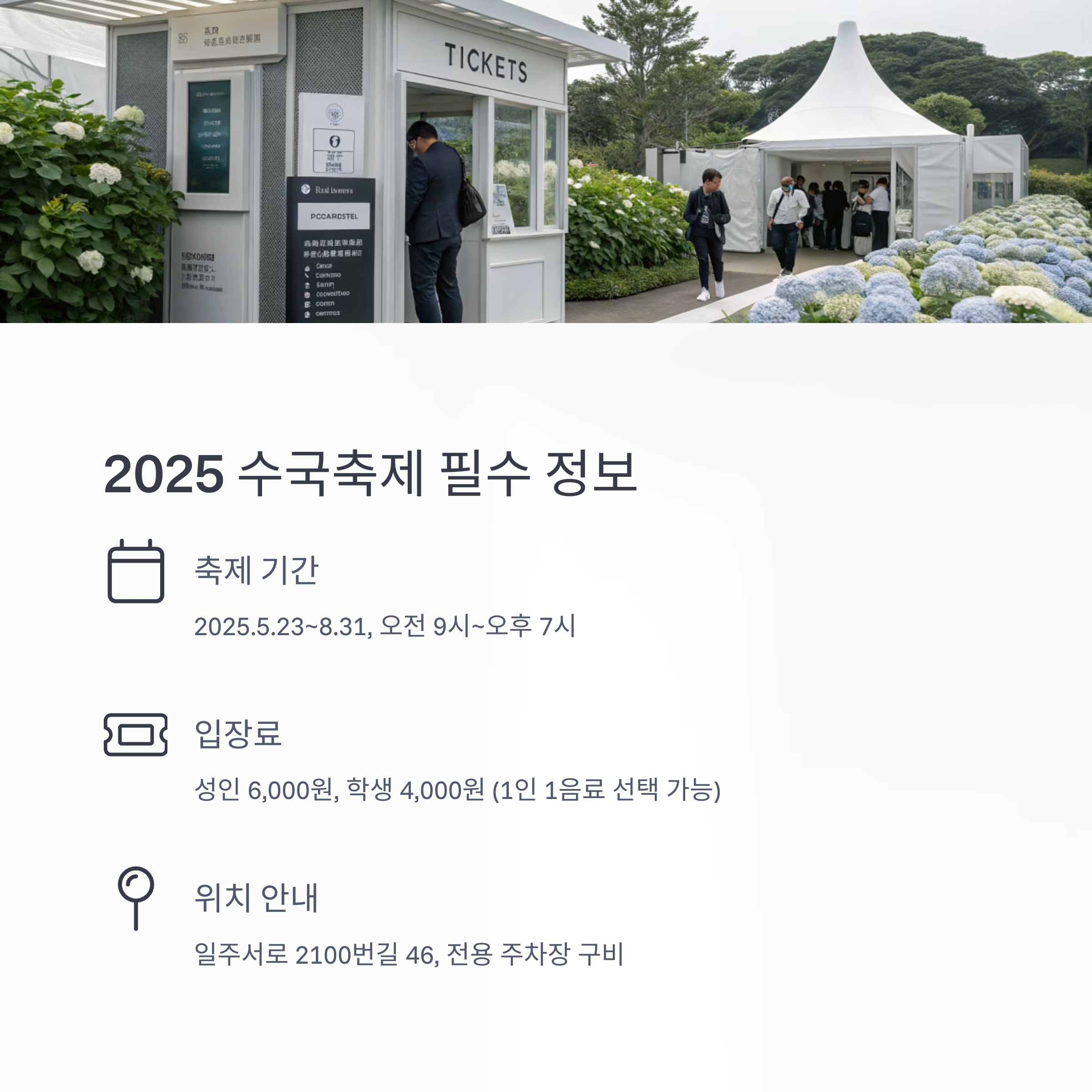 2025년 수국축제는 5월 23일부터 8월 31일까지 열립니다.