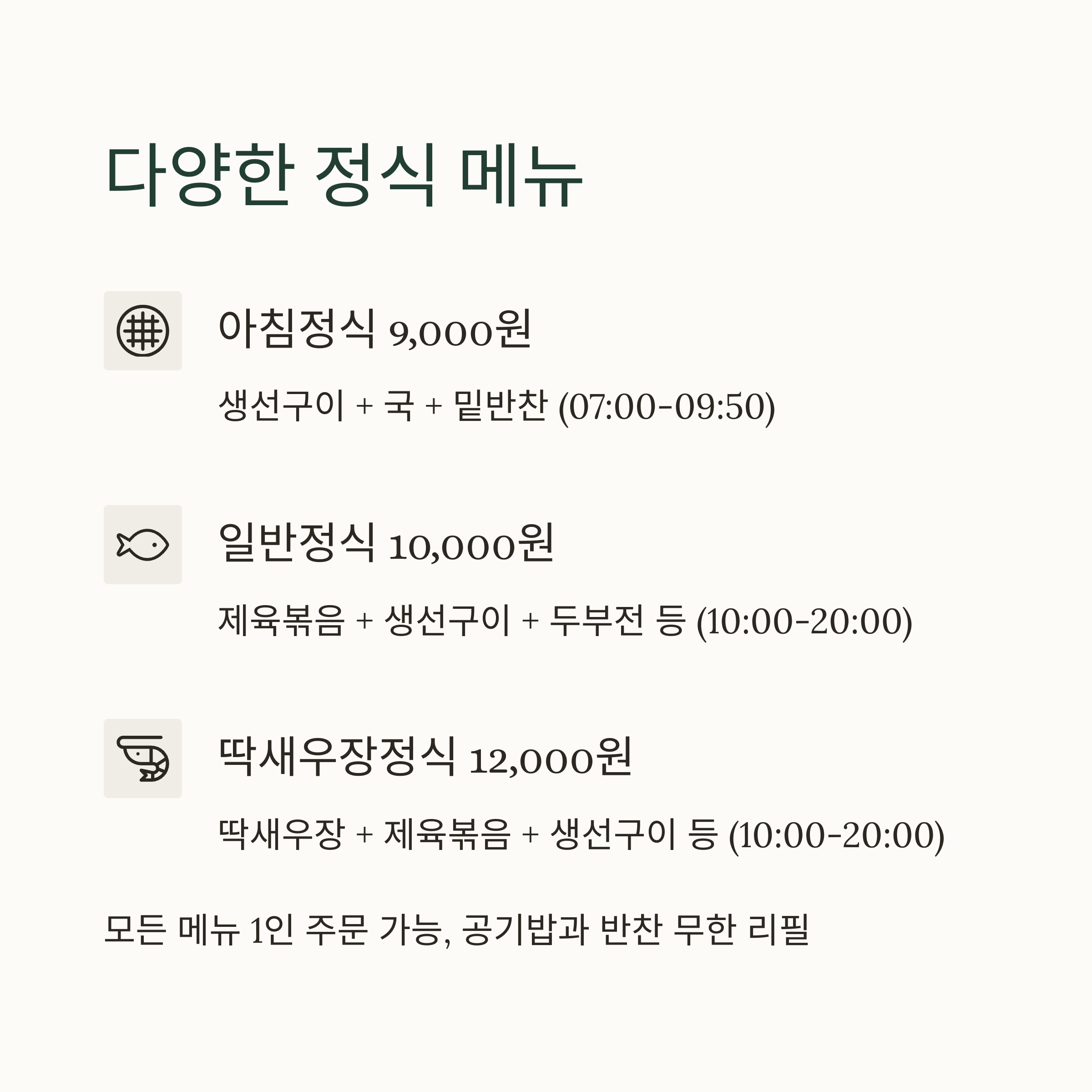 | 아침정식 | 9,000 | 생선구이 + 국(일일 변경) + 밑반찬 | 07:00~09:50 |