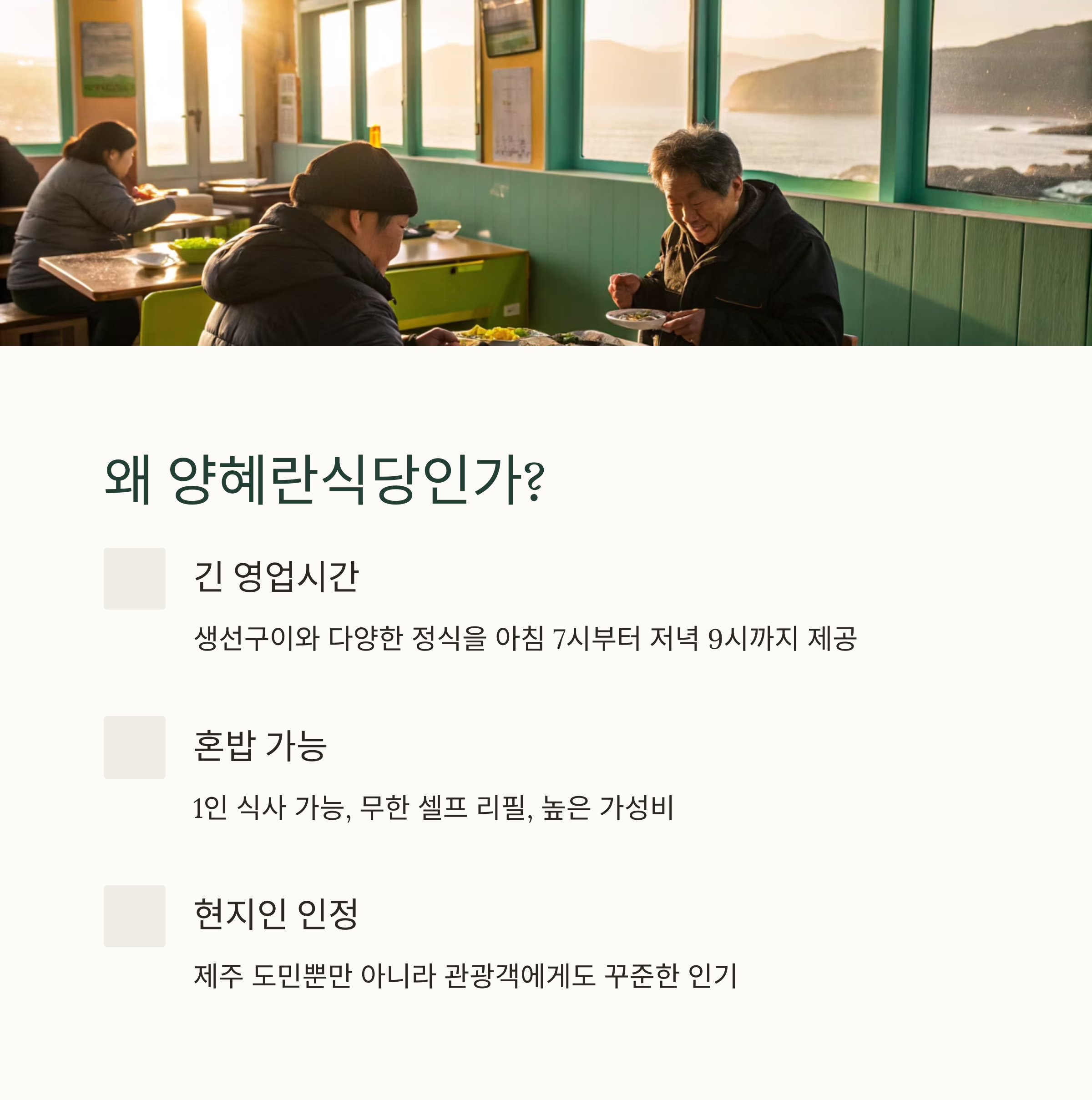 제주 서귀포에서 아침부터 저녁까지 든든한 한 끼를 찾는다면, 현지인이 자주 찾는 양혜란식당이 제격입니다