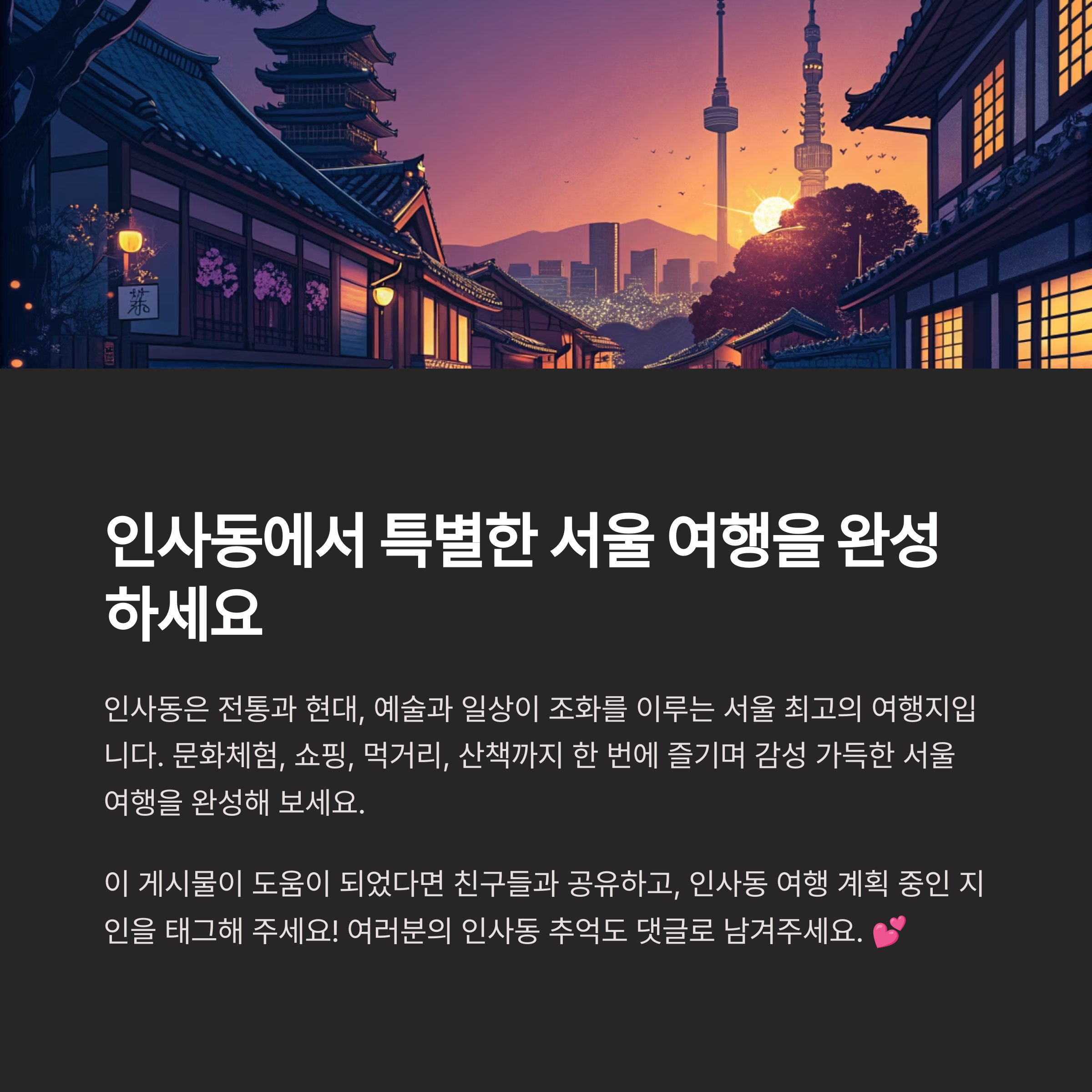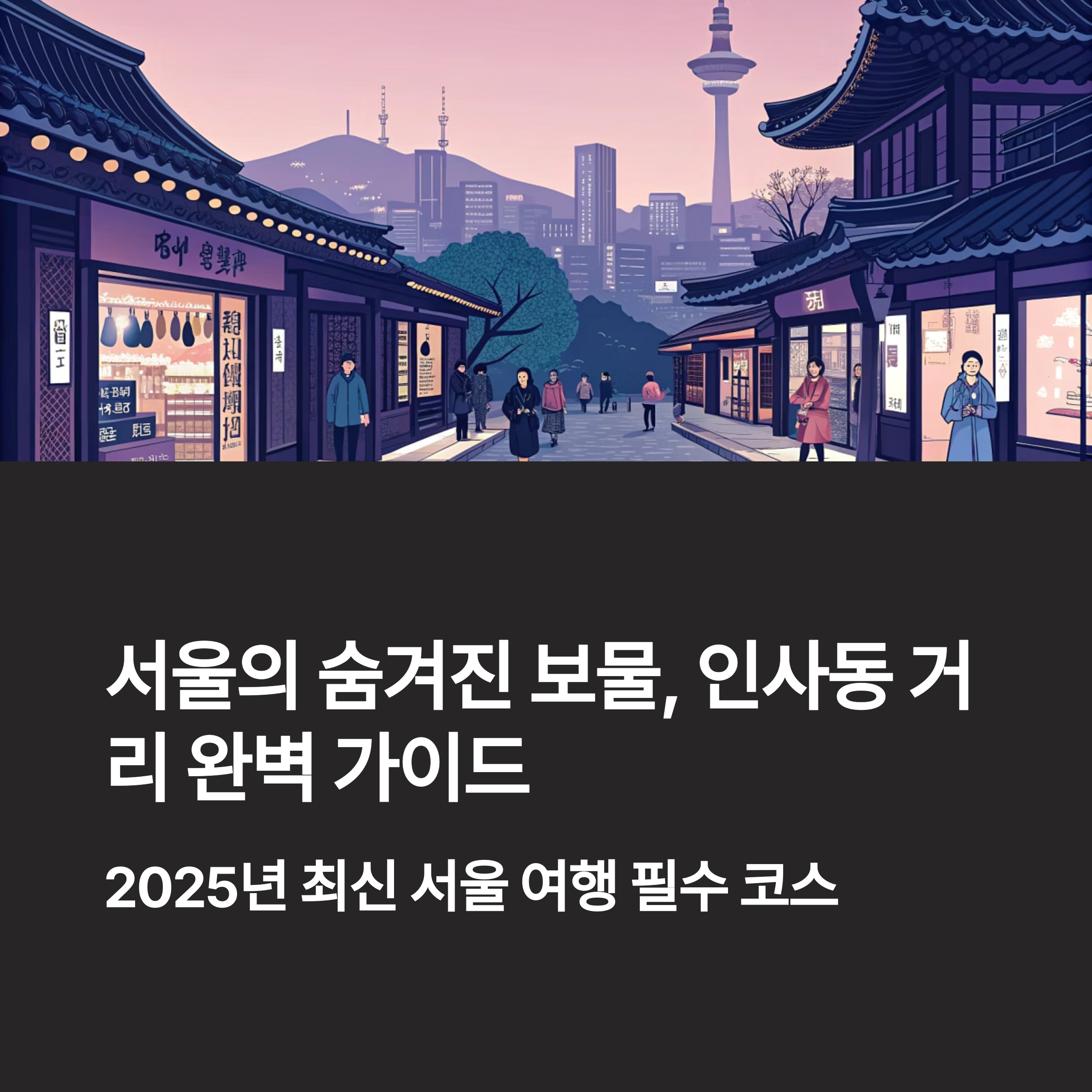 인사동은 전통과 현대, 예술과 일상이 조화를 이루는 서울 최고의 여행지입니다. 문화체험, 쇼핑, 먹거리, 산책까지 한 번에 즐기며 감성 가득한 서울 여행을 완성해 보세요. 2025년에도 인사동은 변함없이 서울 여행의 필수 코스입니다!