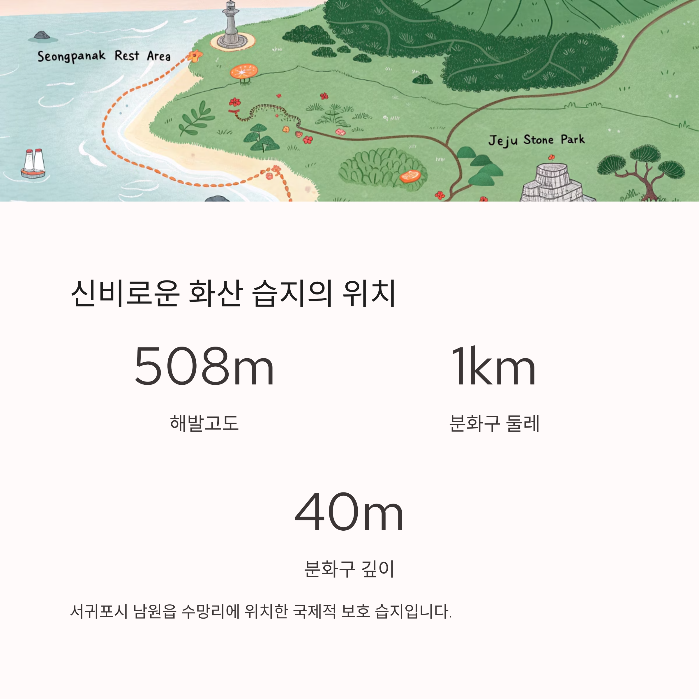 해발고도 508m, 분화구 둘레 약 1km 규모를 자랑합니다. 이곳의