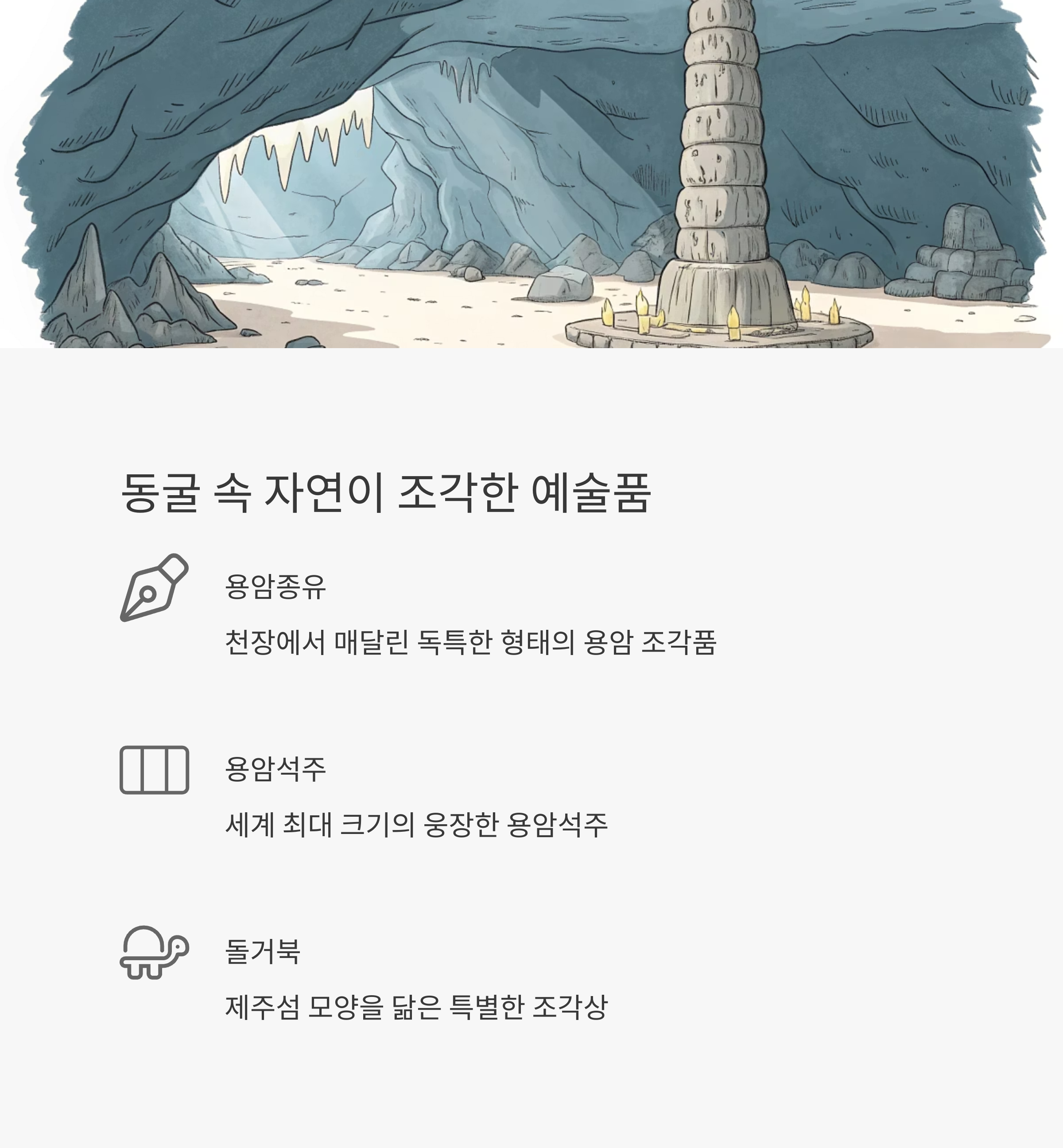 만장굴은 화산섬 제주가 품은 지하의 비밀을 오롯이 보여주는 곳입니다. 이곳에서 자연이 수십만 년 동안 빚어낸 걸작을 마주하며, 지구의 역사를 몸소 체험해 보시기 바랍니다. 여행의 깊이를 더하는 의미 있는 장소로, 만장굴은 언제나 제주 여행객을 기다리고 있습니다.