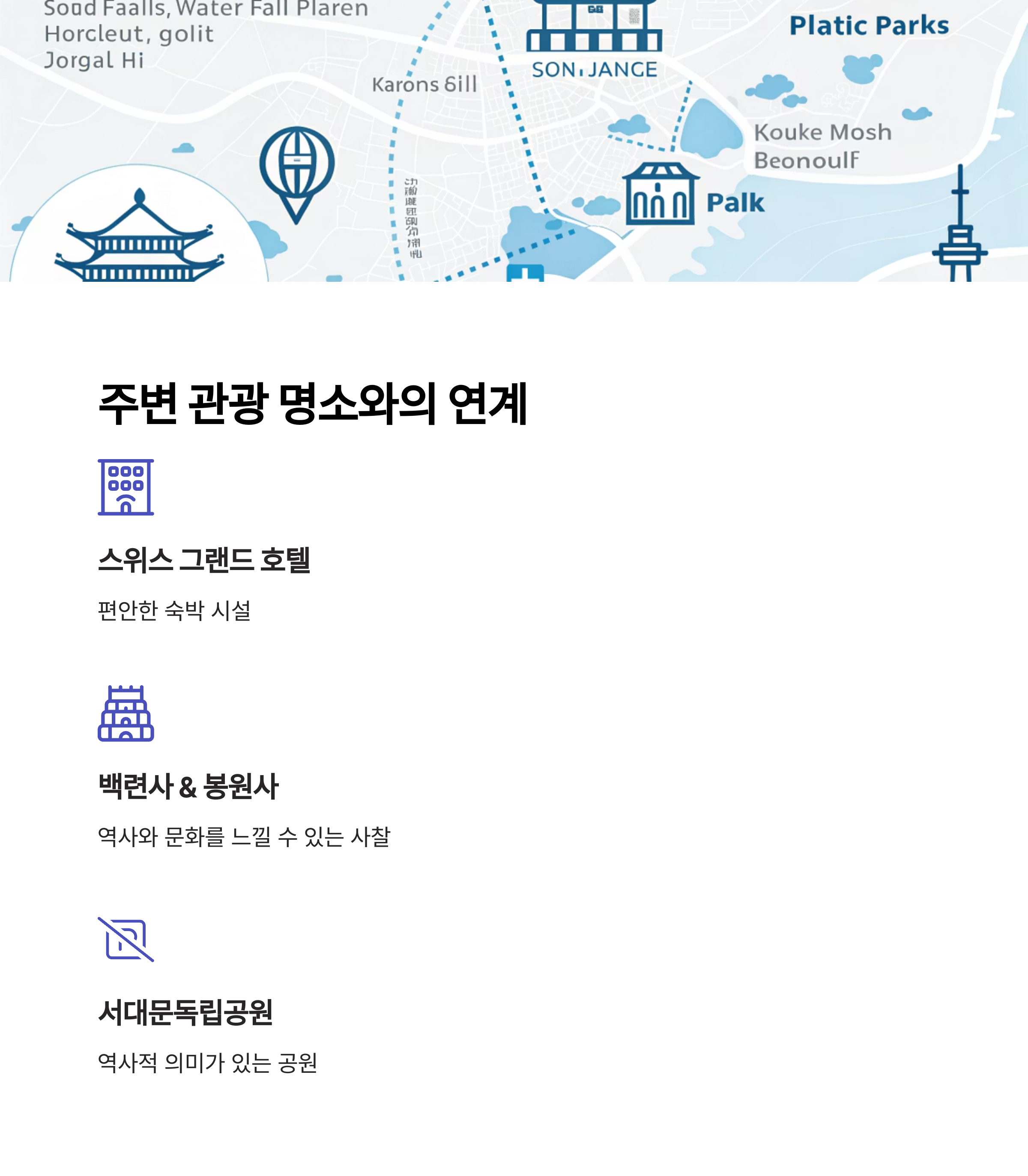 백련사, 봉원사, 서대문독립공원 등이 가까이 있어 연계 관광이 용이합니다.