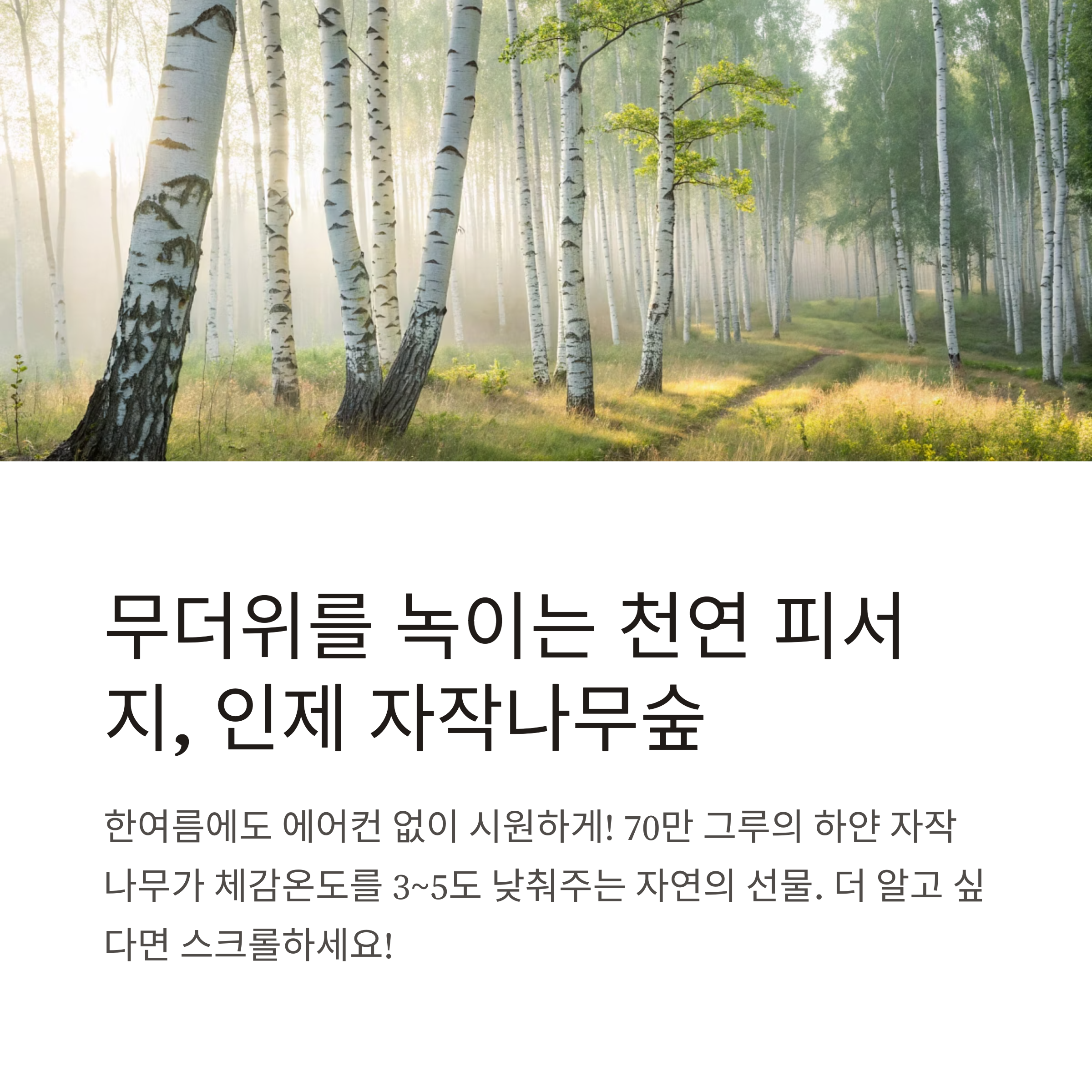 한여름, 에어컨 없이도 시원하게 보내고 싶다면? 강원도 인제 자작나무숲은 자연이 만들어낸 진짜 ‘자연산 피서지’로, 7월 폭염 속에서도 시원한 공기와 하얀 숲의 청량함을 그대로 느낄 수 있는 국내 여름 명소입니다. 뙤약볕 아래 도심의 열기에서 벗어나, 숲속에서 걷는 산책은 여름의 피로를 씻어내는 힐링의 시간이 될 것입니다.