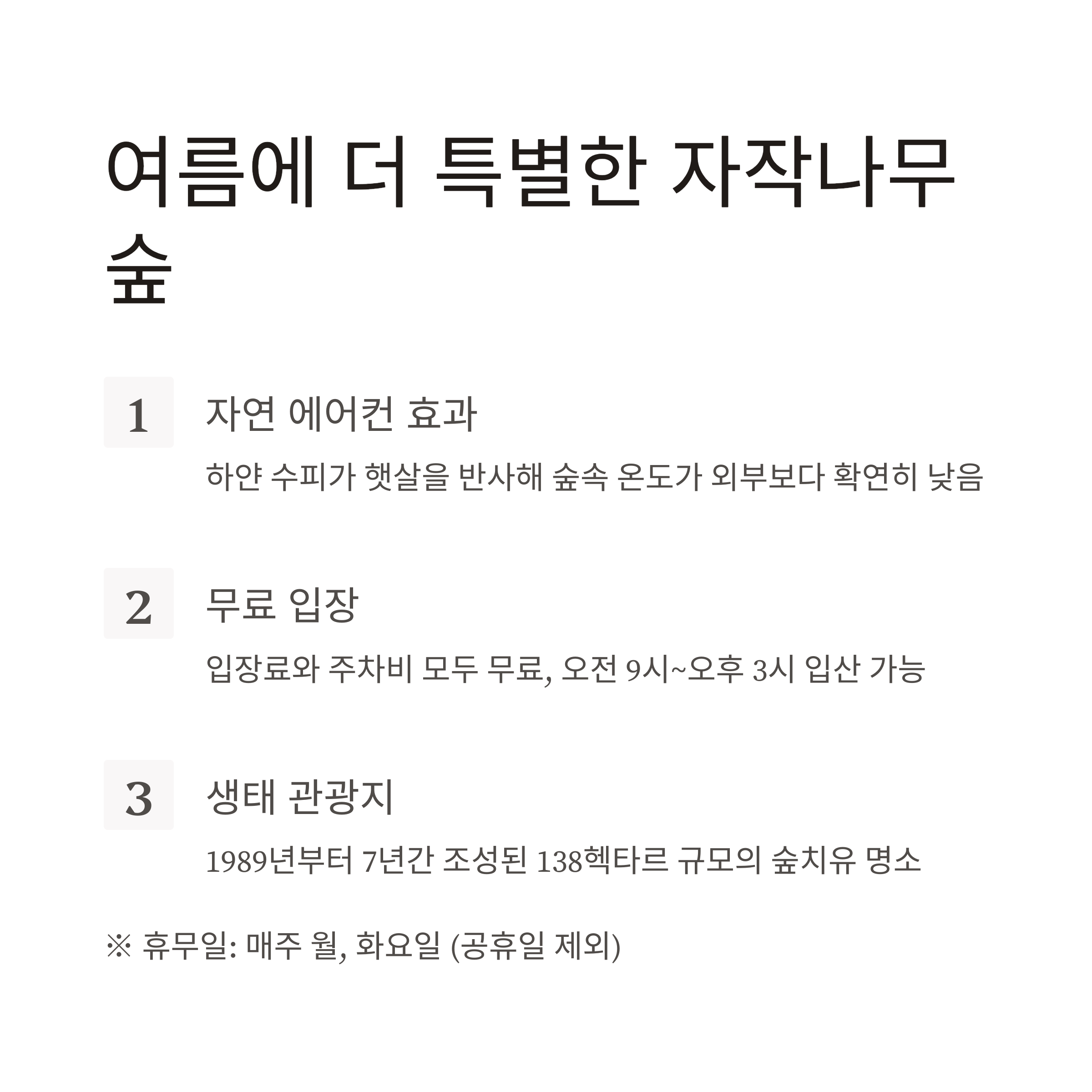 하얀 나무들이 만들어내는 숲의 질서, 풍성한 녹음, 걷기 좋은 데크길과 숲속에서 들려오는 물소리는 도시의 번잡함에서 벗어난 '자연 속 쉼표'를 제공합니다.