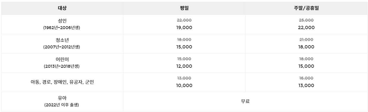 | 자유이용권 (평일 전용) | 대인 30,000원 / 소인 25,000원 |