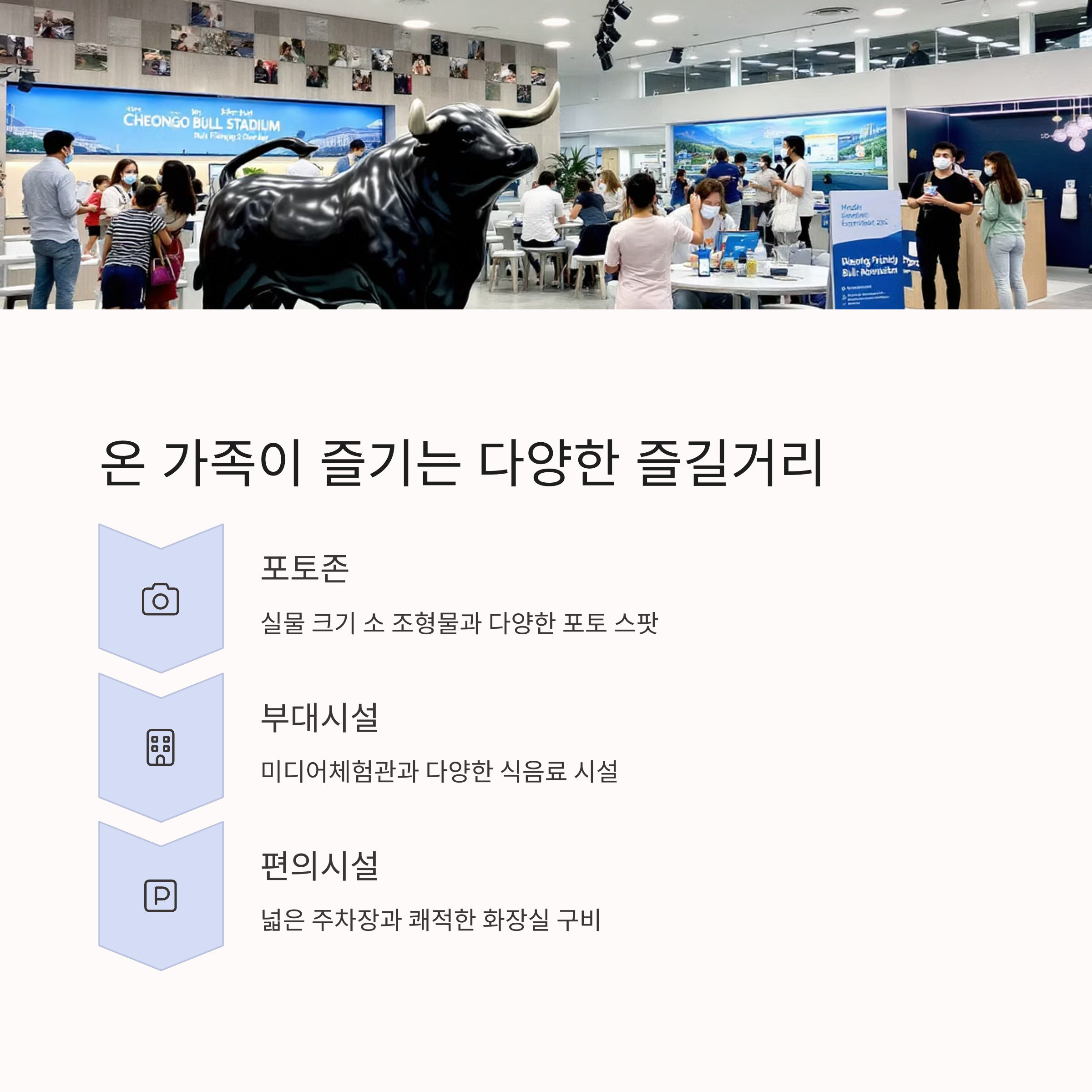 청도 소싸움경기장은 실내 좌석으로 쾌적하며, 포토존, 미디어관, 어린이 체험공간 등 가족 단위 방문객을 위한 시설이 잘 갖춰져 있습니다.