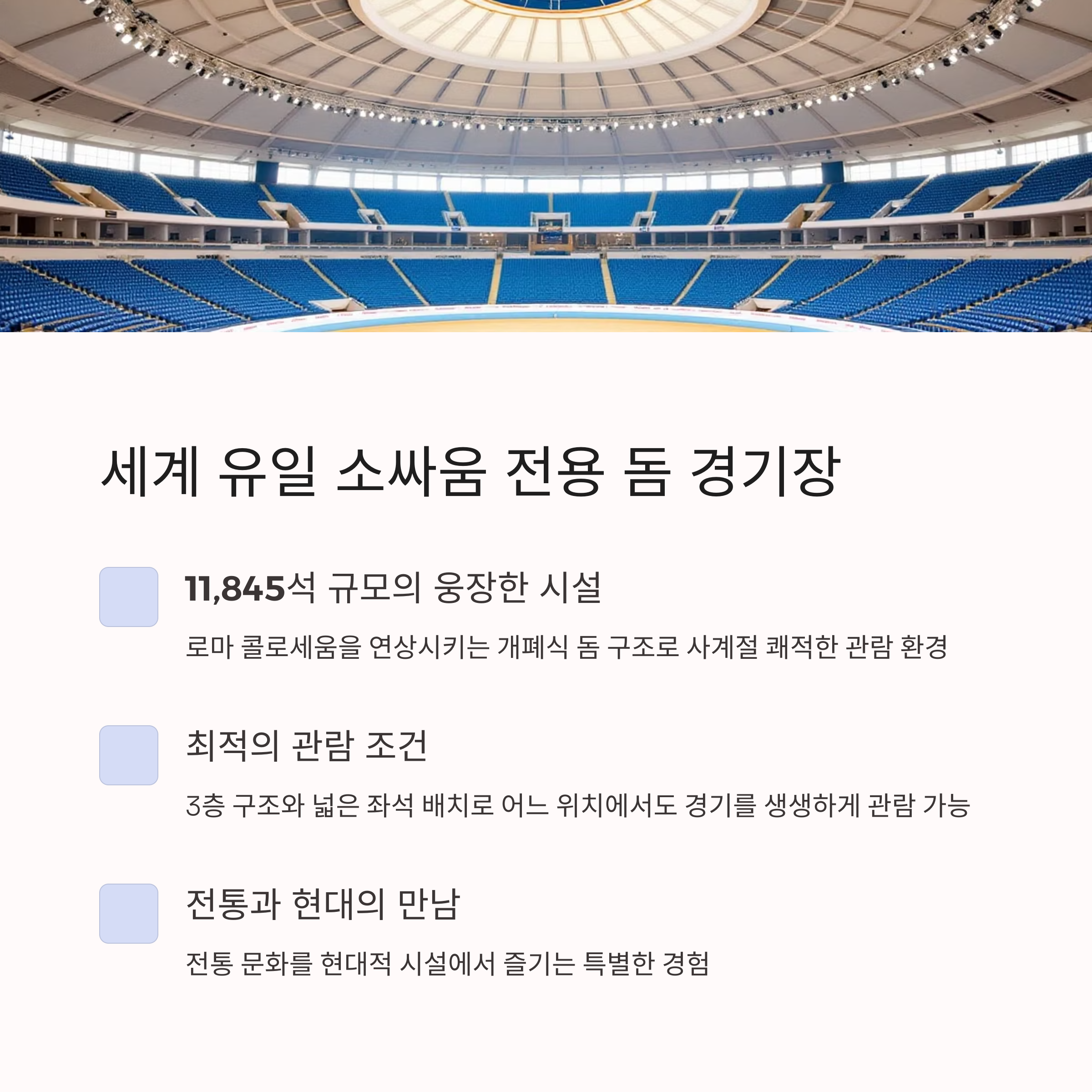 세계 유일 돔형 소싸움장 주차 무료, 실내좌석, 가족 방문 추천 루지 할인 혜택 제공 (우권 구매 시)