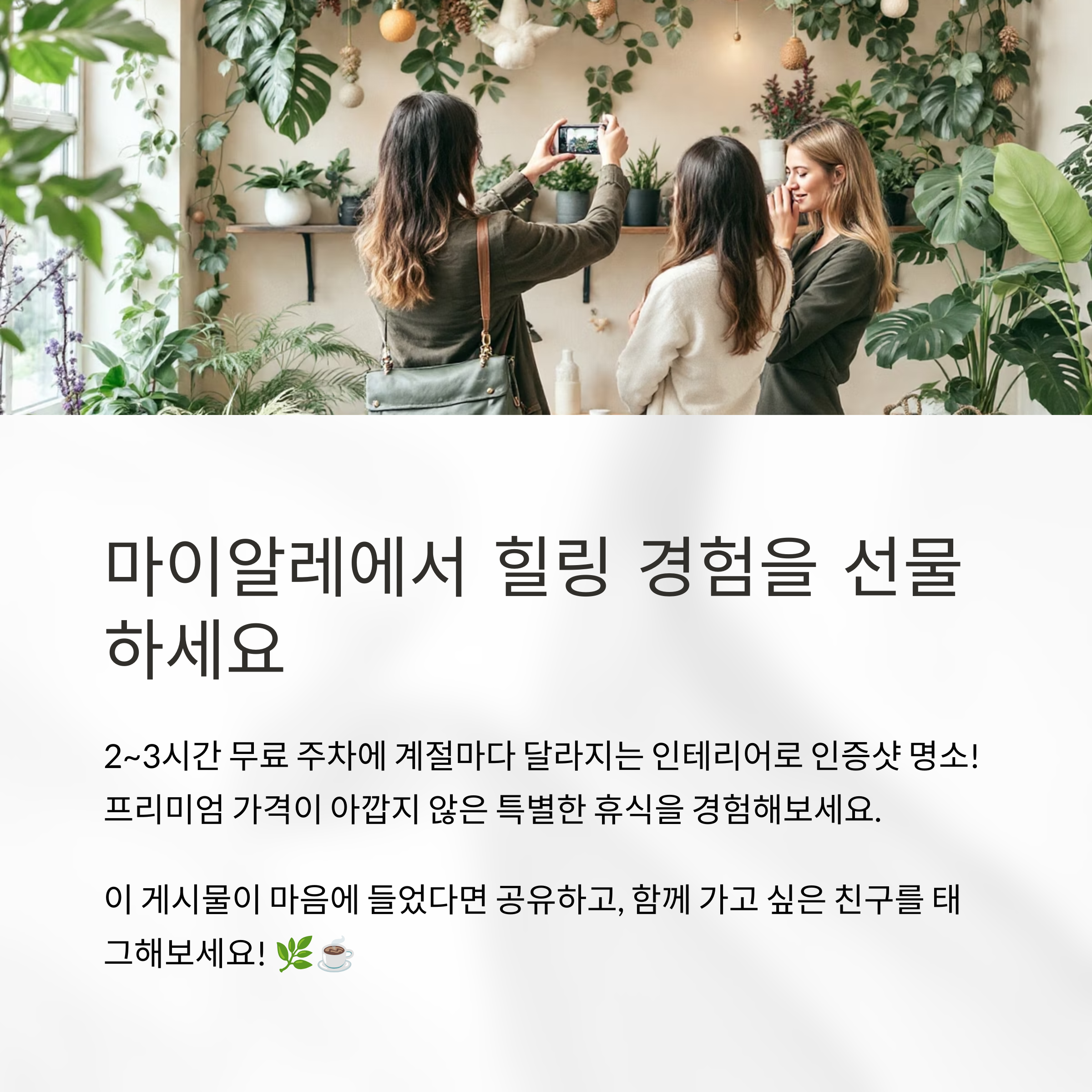 카페 마이알레(My Allee)는 단순한 대형카페를 넘어 플랜테리어 감성, 맛있는 식사와 커피, 쇼핑과 전시까지 모두 아우르는 복합문화공간입니다. 계절에 따라 변하는 자연, 포토존, 반려동물 동반 가능 공간, 주차 혜택 등 다양한 요소들이 어우러져 서울 근교 나들이 장소로 꾸준한 인기를 얻고 있습니다. 분위기 좋은 공간에서 여유를 느끼고 싶다면 이번 주말엔 과천 마이알레로 발걸음을 옮겨보세요.