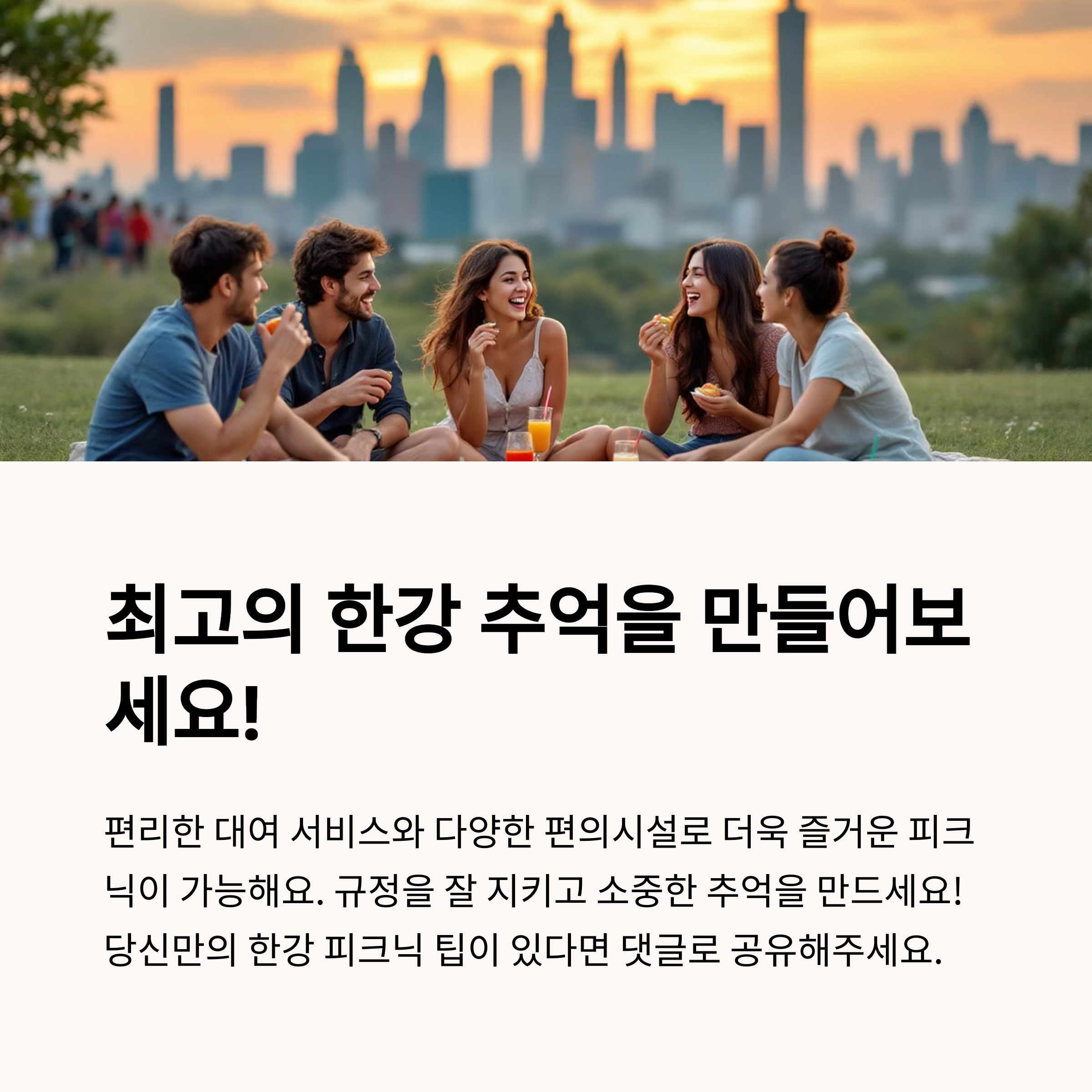 반포한강공원은 도심 속에서 자연과 여유를 동시에 누릴 수 있는 최고의 장소입니다. 특히 달빛무지개분수와 같은 이색적인 야경 요소는 피크닉의 낭만을 배가시켜 줍니다. 텐트나 그늘막 사용 시 규정을 잘 지킨다면 더욱 안전하고 쾌적한 시간을 보낼 수 있습니다. 주차, 대중교통, 편의시설 등도 잘 마련되어 있어 누구나 쉽게 접근할 수 있는 것도 큰 장점입니다. 가족 단위의 휴식, 연인의 데이트, 혼자만의 힐링 타임 등 다양한 상황에서 활용할 수 있는 반포한강공원에서 특별한 하루를 계획해보세요.