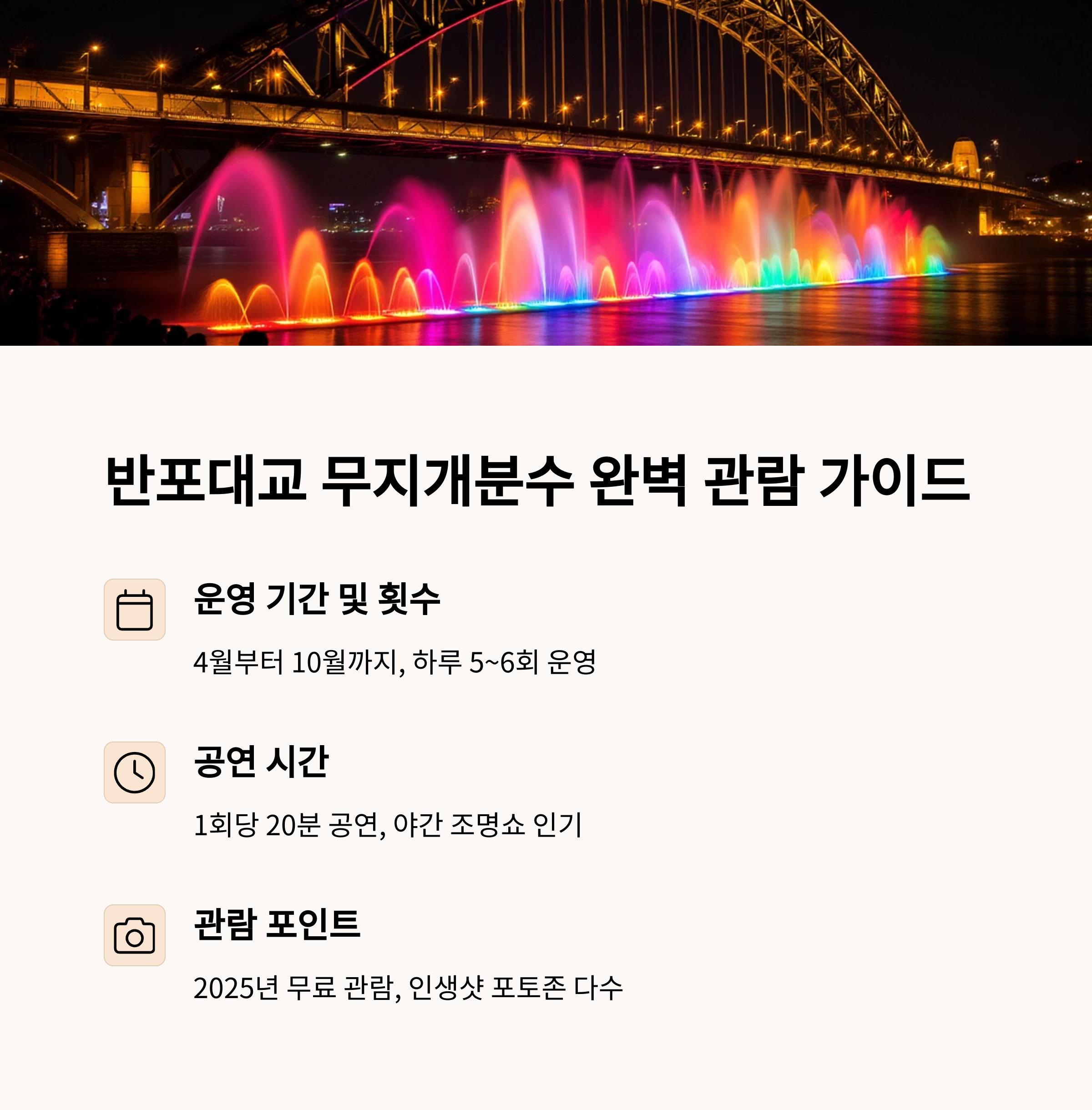 분수 가동시간은 4월부터 10월까지이며, 비수기에는 하루 5회, 성수기에는 6회 운영됩니다. 한 번에 20분씩 가동되며, 기상 상황에 따라 일정이 변경될 수 있습니다. 우천이나 강풍, 한강의 탁도 등 환경 조건이 기준 이상일 경우 분수는 가동을 멈추게 되니 방문 전 확인이 필요합니다. 또한 분수의 방향도 상황에 따라 달라질 수 있어, 관람 위치를 고를 때 참고하는 것이 좋습니다. 특히 여름철에는 분수 가동 시간이 늘어나 야경 관람에 더욱 알맞은 일정이 됩니다.