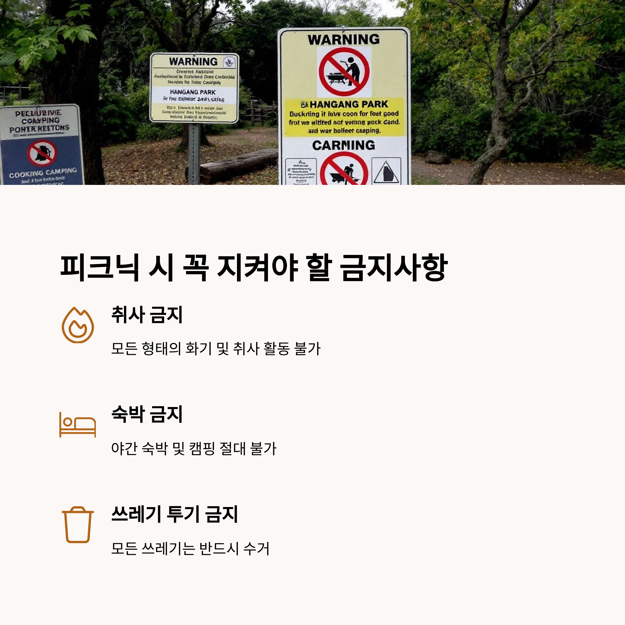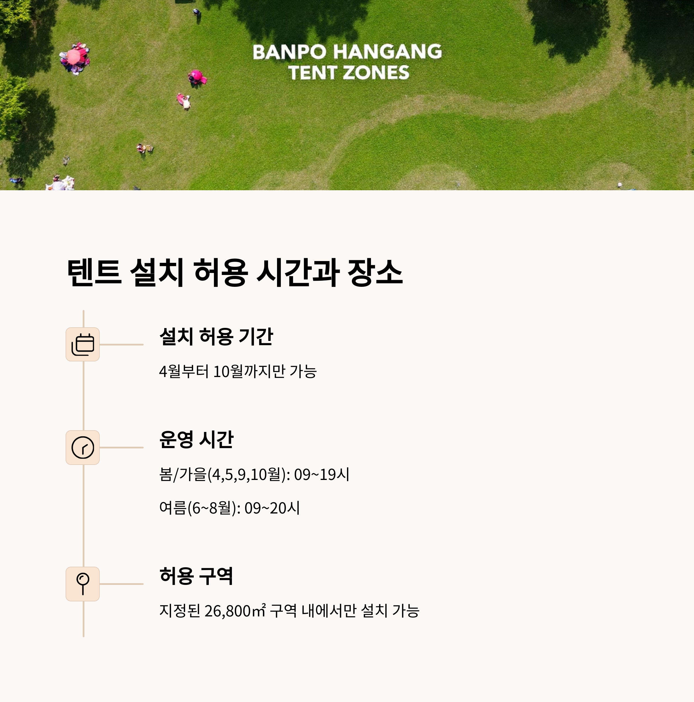 | 텐트 설치 규정 | 2면 이하 개방, 지정 구역 내, 철제핀 금지 |