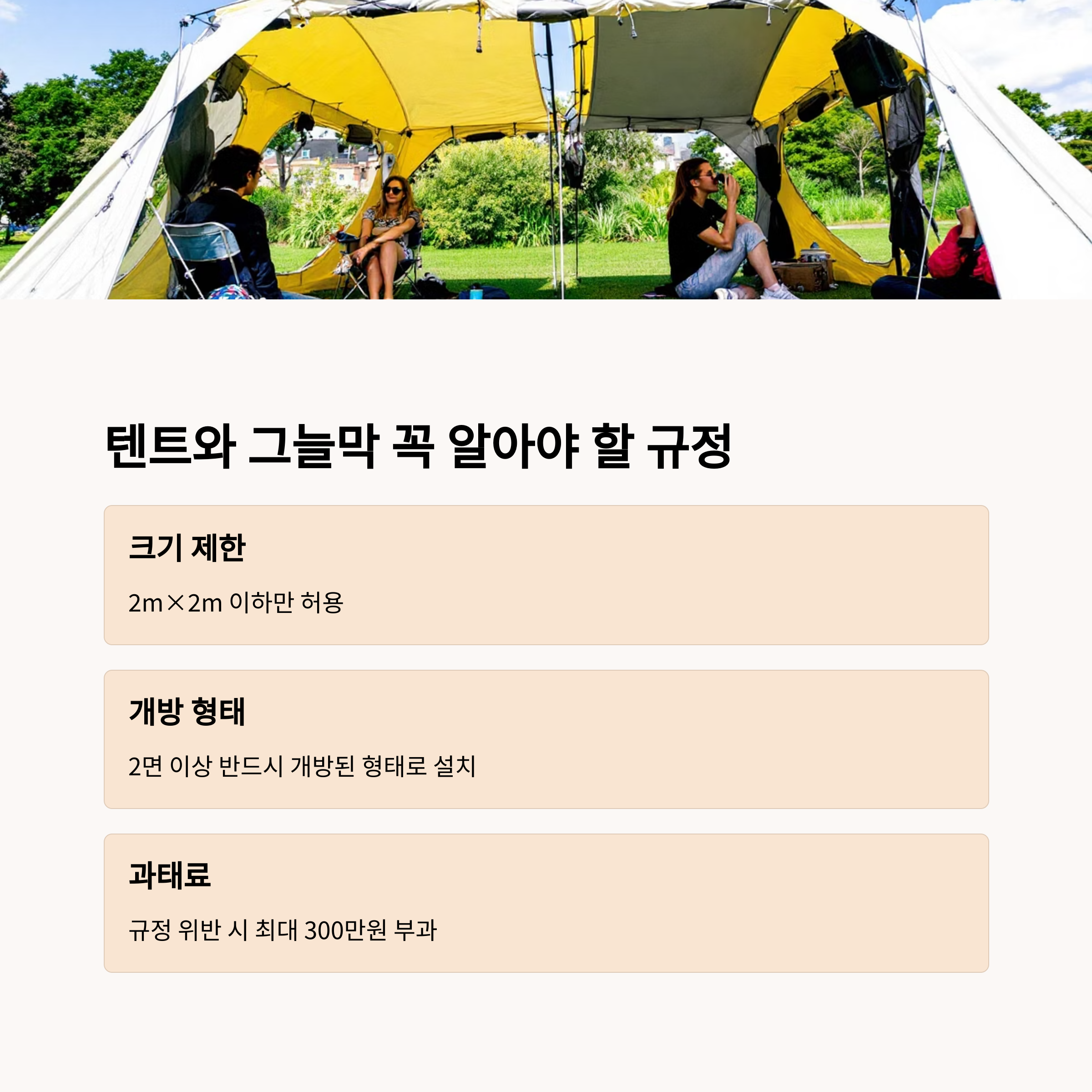 텐트 설치는 지정된 피크닉장 구역 내에서만 허용되며, 규격도 2m x 2m 내외, 2면 이하 개방 형태만 가능합니다. 지정구역 외 설치 시 과태료가 부과되며, 철제 핀이나 지주팩 사용도 금지되어 있어 바람에 대비한 안전한 설치가 필요합니다. 텐트는 대여도 가능하지만 운영시간과 반납 시간, 추가 비용 등을 사전에 확인하는 것이 중요합니다. 이러한 정보들을 미리 숙지하면 보다 쾌적하고 안전한 피크닉을 즐길 수 있습니다.