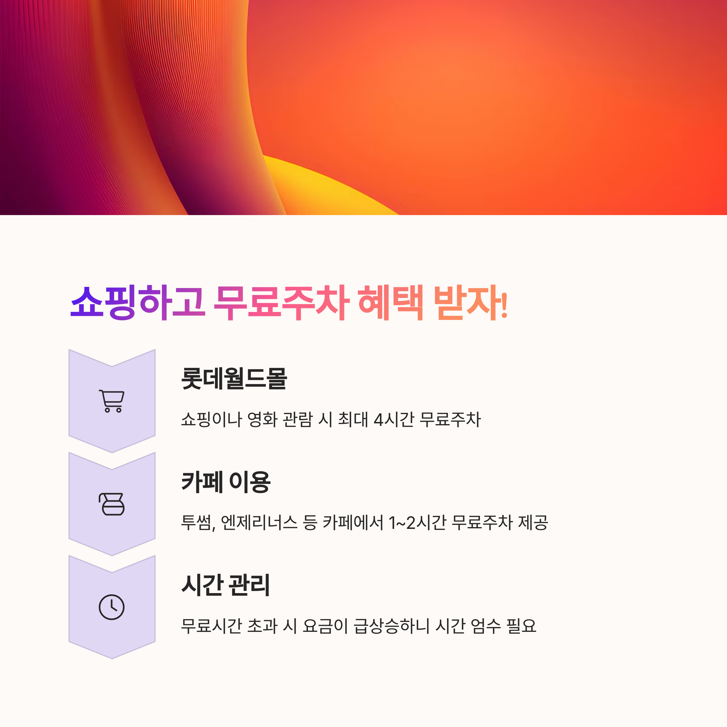 | 주말 오전 10시 이전 방문 추천 | 영화·전망대 이용 시 최대 4시간 할인 가능 | 빈자리 실시간 확인, 예약 기능 활용 가능 |