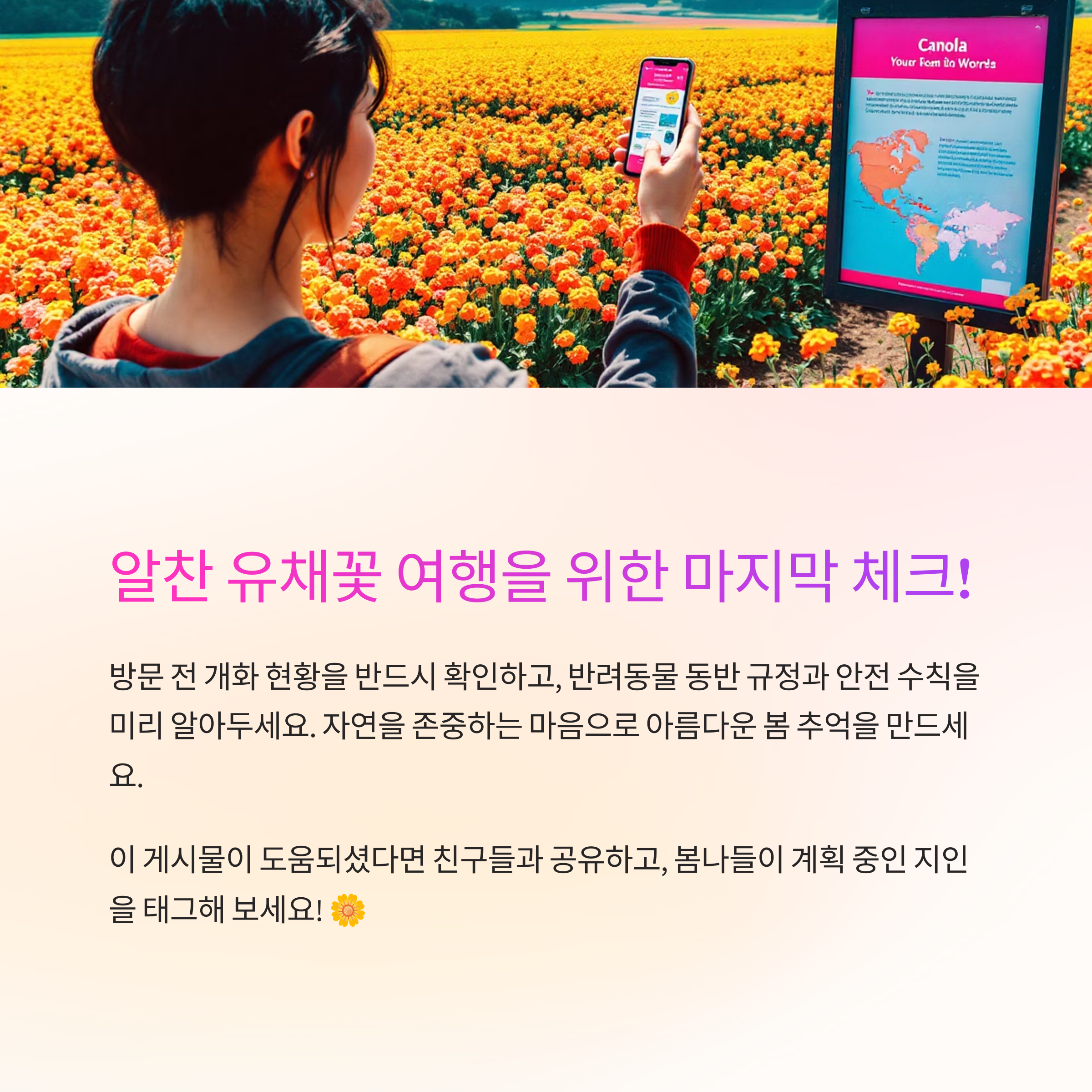 유채꽃 외에도 부안의 숨은 명소, 가족과 함께 다녀온 후기 등 여러분의 여행 이야기를 댓글로 공유해주세요. 더 많은 이들의 여행에 큰 도움이 될 수 있습니다!