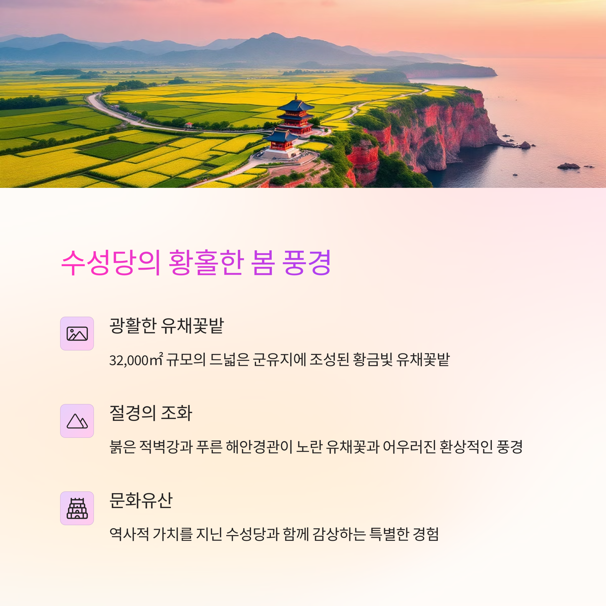| 유채꽃 개화시기 | 수성당 포토존 | 주변 관광지 |