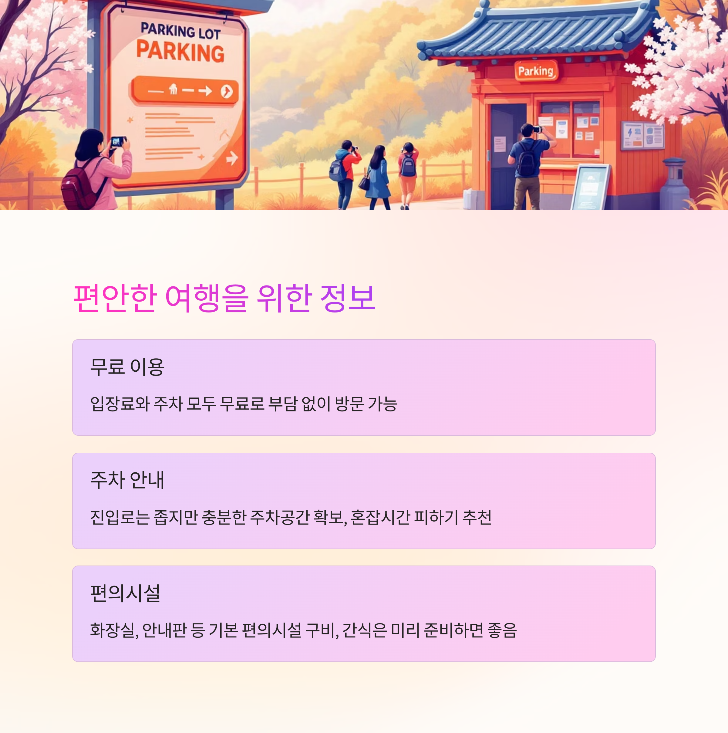 수성당 유채꽃은 3월 중순 개화를 시작해 4월 초~중순 만개합니다. 방문 전 기상 정보와 전북도청 블로그를 통해 개화 정보를 미리 확인하는 것이 좋습니다. 주말에는 다소 혼잡할 수 있으므로 평일 오전 방문을 추천하며, 변산반도국립공원, 채석강, 격포항 등 주변 관광지도 함께 즐기면 봄 여행 코스로 알차게 하루를 보낼 수 있습니다.