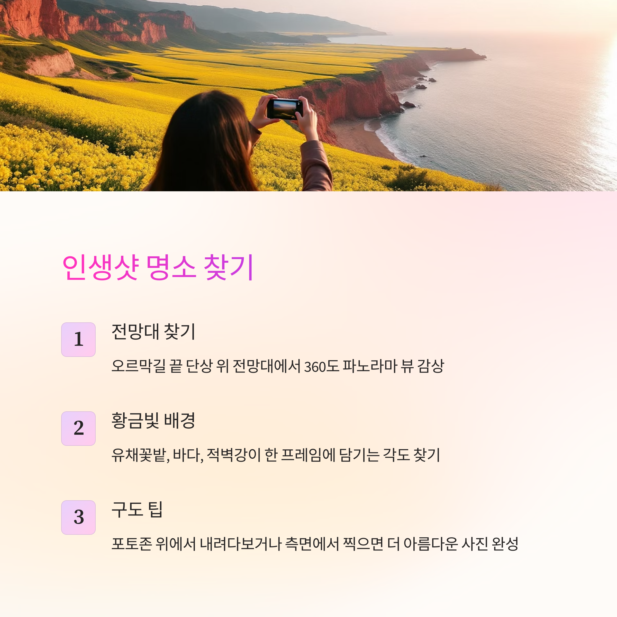 유채꽃 외에도 부안의 숨은 명소, 가족과 함께 다녀온 후기 등 여러분의 여행 이야기를 댓글로 공유해주세요. 더 많은 이들의 여행에 큰 도움이 될 수 있습니다!