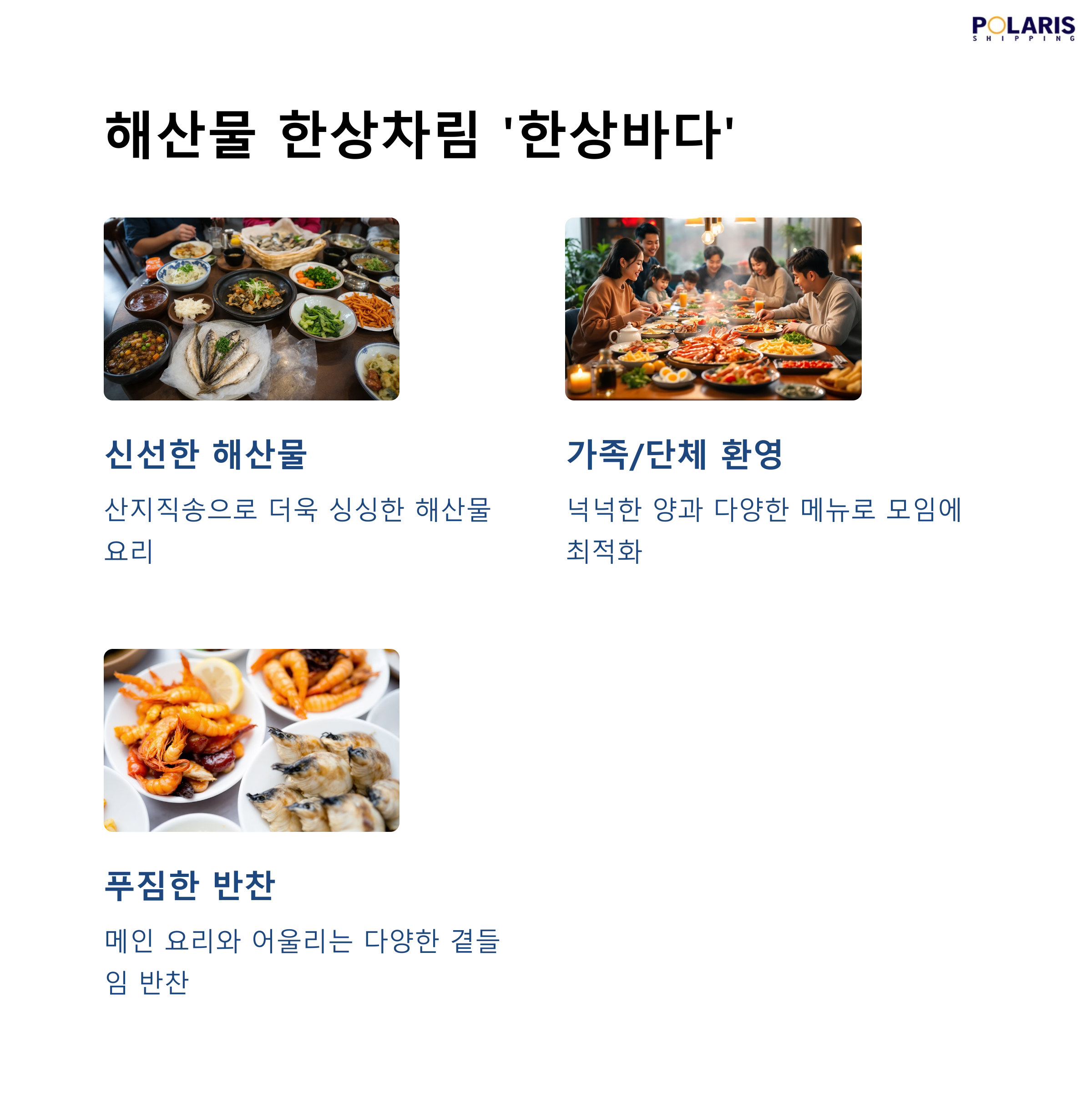 이 외에도 도보 10분 거리의 한상바다에서는 해산물 한상차림을 푸짐하게 즐길 수 있고, 뜨삽, 농부레스토랑은 양식 메뉴를 합리적인 가격에 제공하여 가족 단위나 연인들이 편하게 즐길 수 있는 장소로 추천됩니다. 매운맛이 당길 땐 마라신에서 마라탕이나 마라샹궈로 저녁을 마무리해도 좋습니다.