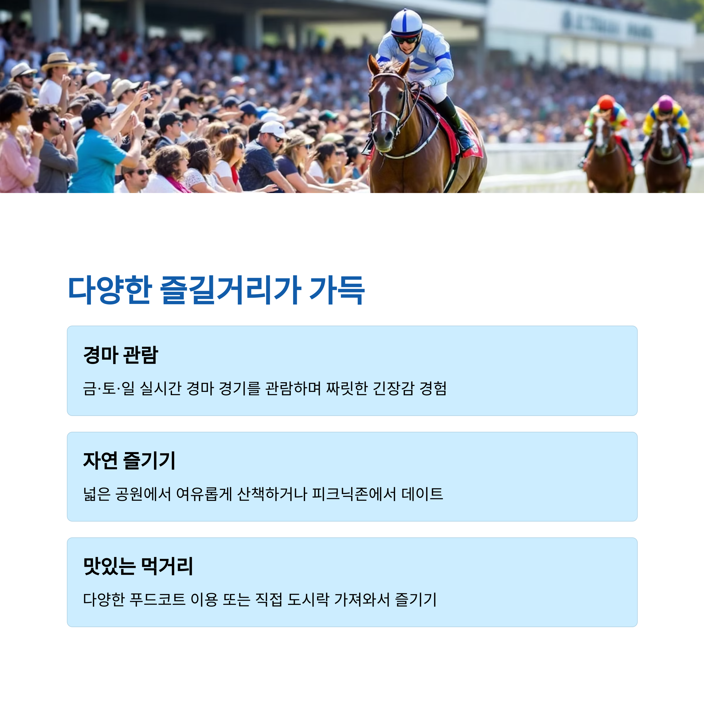 과천 렛츠런파크는 단순한 경마장을 넘어선 복합문화공간으로 자리 잡고 있습니다. 서울 도심에서 지하철 한 번이면 도착할 수 있는 접근성과 피크닉, 경마, 박물관, 체험 공간이 한데 어우러진 구성이 데이트 장소로서도, 가족 나들이 장소로서도 탁월하죠. 특히 주말마다 열리는 경마 이벤트는 생각보다 부담스럽지 않게 접근할 수 있어 처음 방문하는 분들도 재미있게 즐길 수 있습니다. 다양한 식음료 매장과 깔끔한 시설, 그리고 계절별로 진행되는 축제는 렛츠런파크의 매력을 한층 끌어올려 주는 포인트입니다.