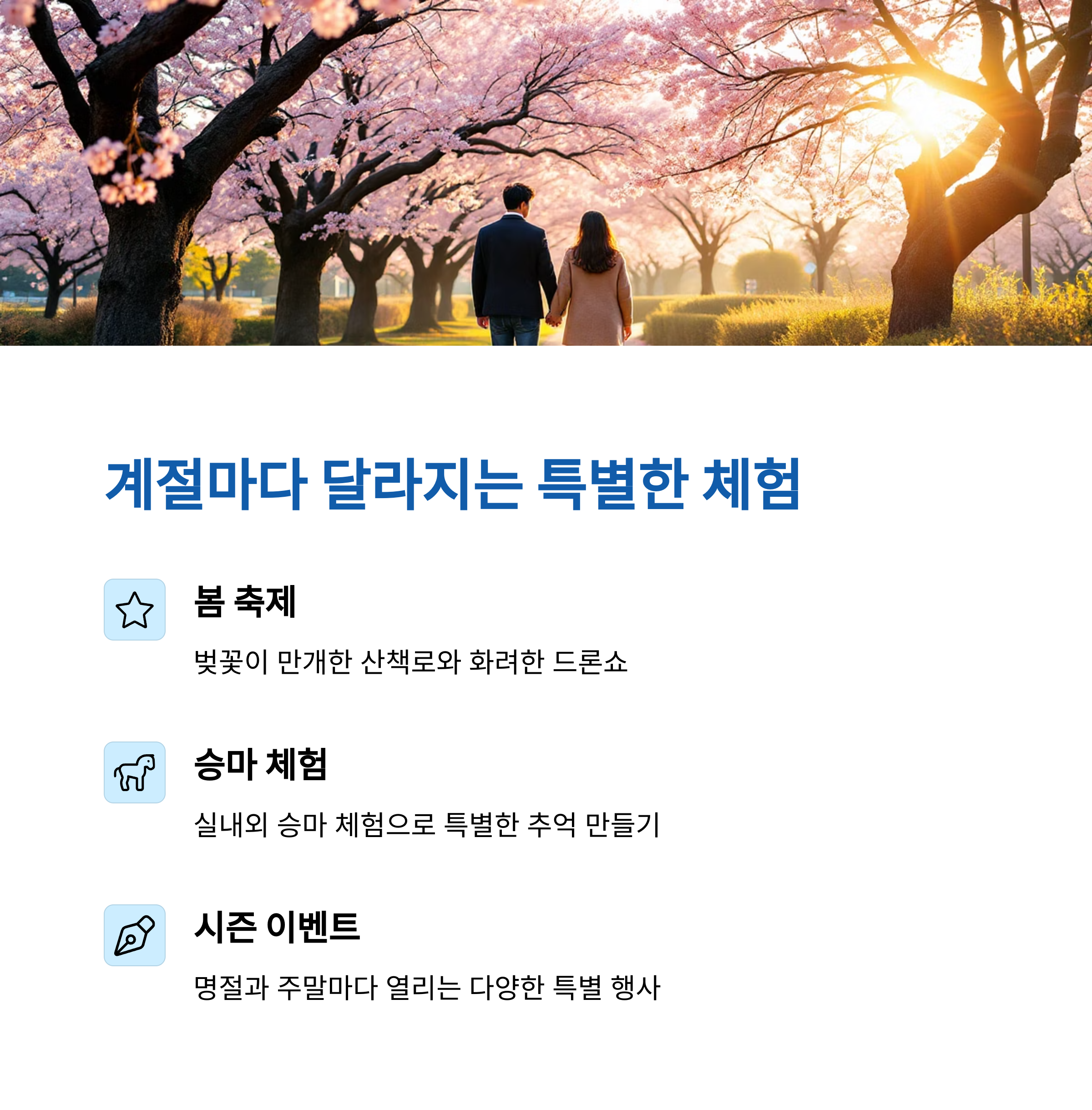 서울에서 가까운 거리에 위치한 과천 렛츠런파크는 단순한 경마장이라는 이미지에서 벗어나 가족, 연인, 친구 모두가 즐길 수 있는 복합문화공간으로 자리잡았습니다. 특히 봄철 벚꽃축제 시즌에는 더욱 아름다운 풍경과 다양한 프로그램이 더해져 많은 이들의 발길을 사로잡고 있죠. 피크닉을 즐기기에도 좋고, 경마 체험박물관, 놀이터, 푸드코트 등 다양한 즐길 거리와 볼거리가 풍부해 하루 종일 머물러도 전혀 지루하지 않은 장소랍니다. 이번 포스팅에서는 렛츠런파크를 보다 알차게 즐기기 위한 입장료, 운영시간, 주차 요금, 추천 포인트 등을 깔끔하게 정리해드리니 꼭 끝까지 읽어보세요.