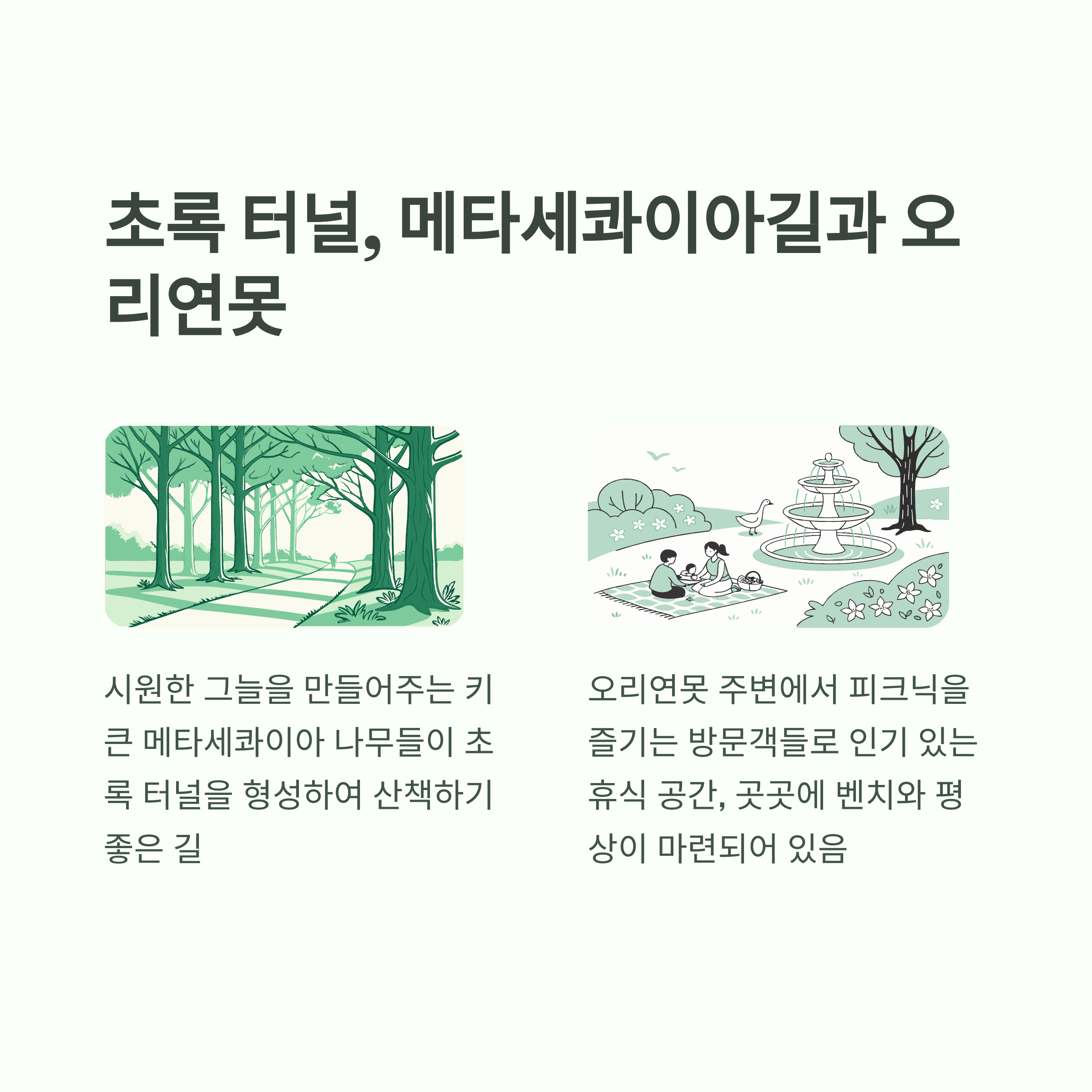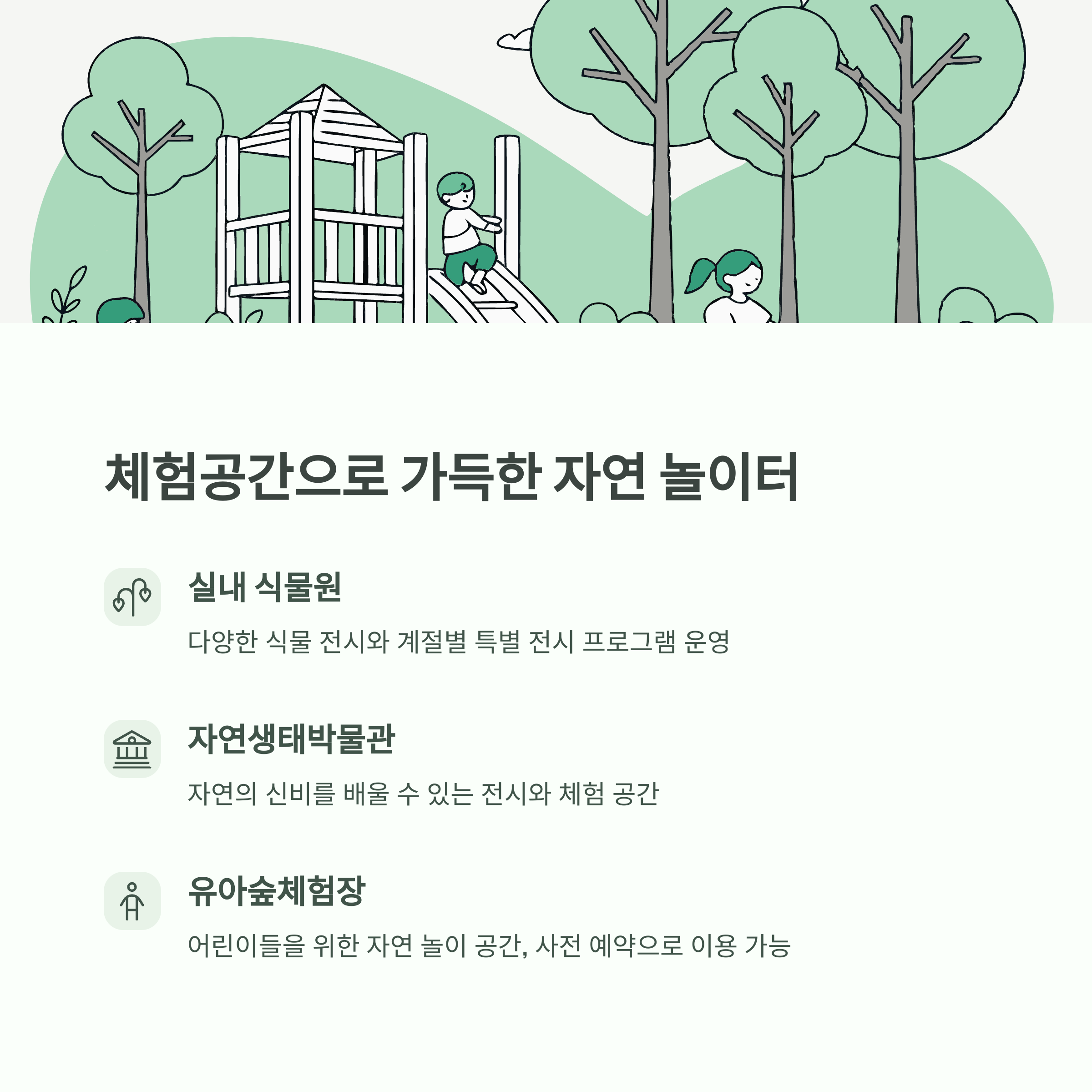 이곳의 가장 큰 매력 중 하나는 다양한 볼거리입니다. 붓꽃이 만발하는 붓꽃원, 고즈넉한 기운을 느낄 수 있는 메타세콰이아길, 신선한 자연과 함께하는 오리연못과 인공폭포 등 각기 다른 매력을 가진 공간이 곳곳에 마련되어 있어 방문하는 내내 지루할 틈이 없습니다. 또한 실내에서도 사계절을 느낄 수 있는 식물원과 아이들의 오감을 자극하는 자연생태박물관도 가족 단위 방문객에게 큰 인기를 끌고 있습니다.