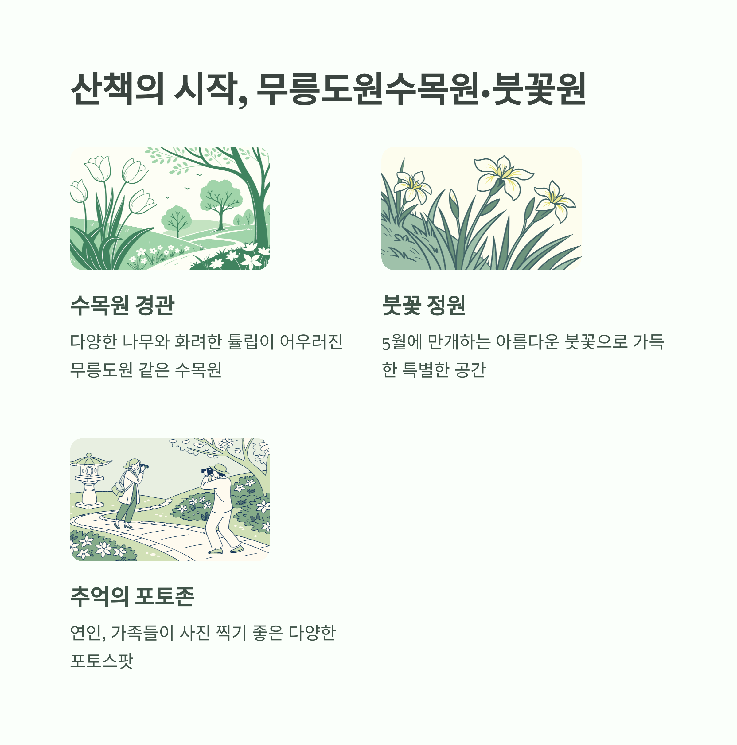 5월에는 벚꽃과 튤립의 화려한 향연이 끝나고, 붓꽃과 공조팝나무 등 다양한 봄꽃들이 공원 곳곳을 아름답게 수놓습니다. 초록으로 가득 찬 산책로를 따라 걸으며 자연의 싱그러움을 온몸으로 느낄 수 있어 봄철 최고의 힐링 코스로 손꼽힙니다. 주말에는 다소 붐빌 수 있으니 평일 방문을 추천드립니다.