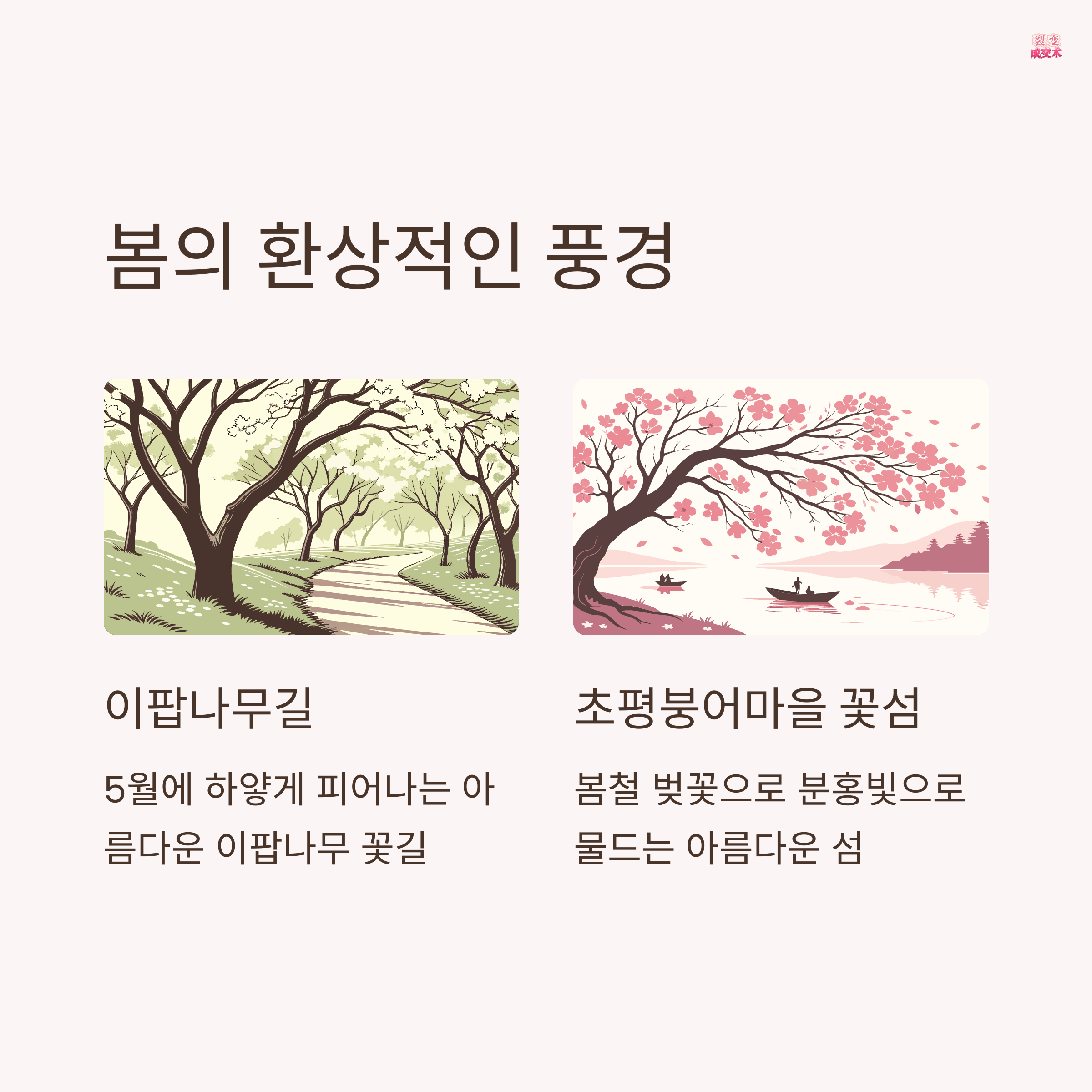 이팝나무길과 초평붕어마을 꽃섬은 5월에 가장 아름다운 경관을 자랑합니다. 백곡천을 따라 조성된 이팝나무길은 하얀 꽃으로 가득 찬 산책로를 제공하며, 초평저수지에 위치한 꽃섬은 벚꽃과 고요한 호수 풍경이 어우러져 방문객에게 평온함을 선사합니다. 특히 이팝나무 꽃축제와 같은 지역 행사 기간에는 다양한 부대 프로그램도 함께 즐길 수 있어 가족 단위 나들이에 최적입니다.