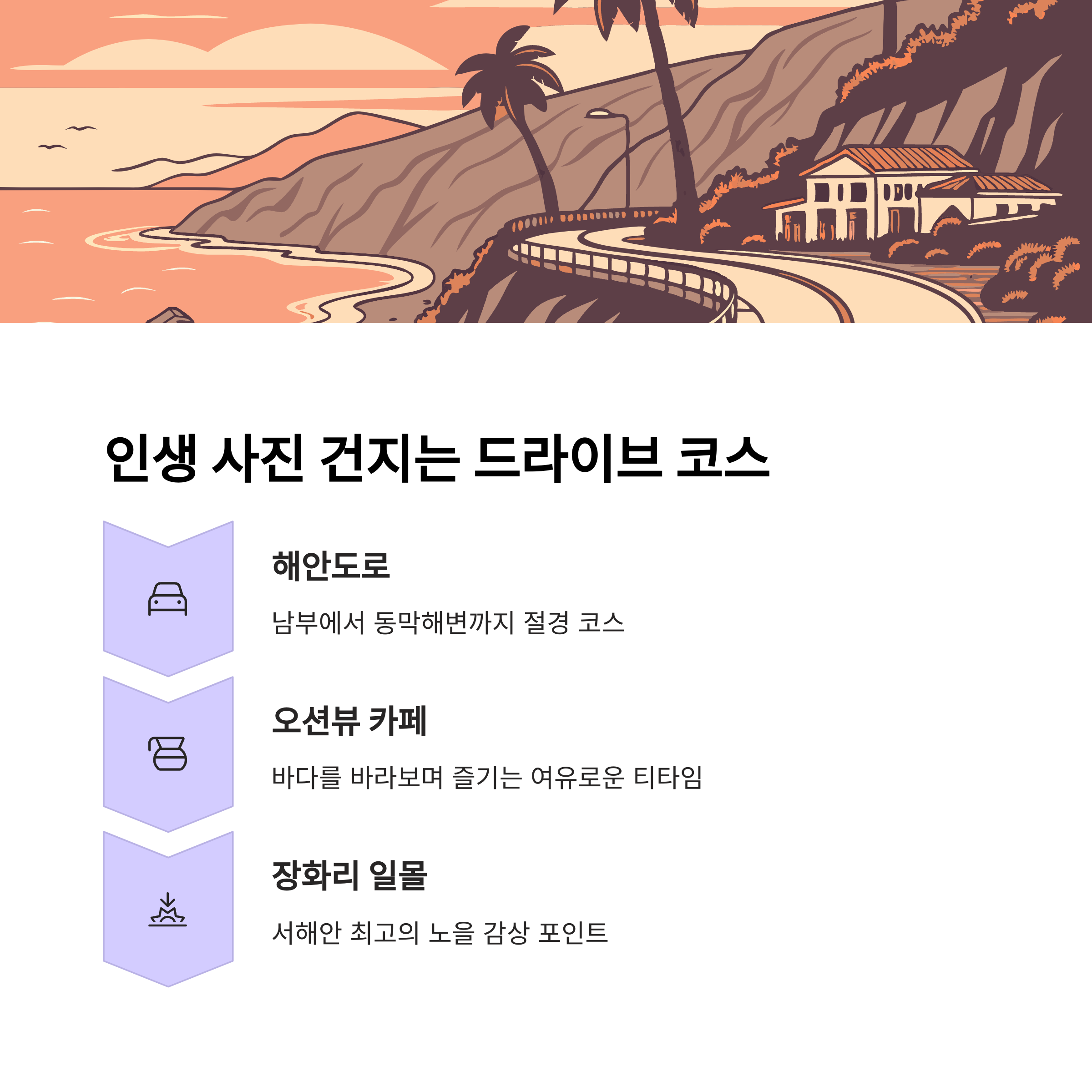 | 역사와 자연이 조화를 이루는 명소들 | 드라이브 중 다양한 오션뷰 카페 방문 가능 | 재래시장과 현지 카페에서 지역 특산물 체험 |