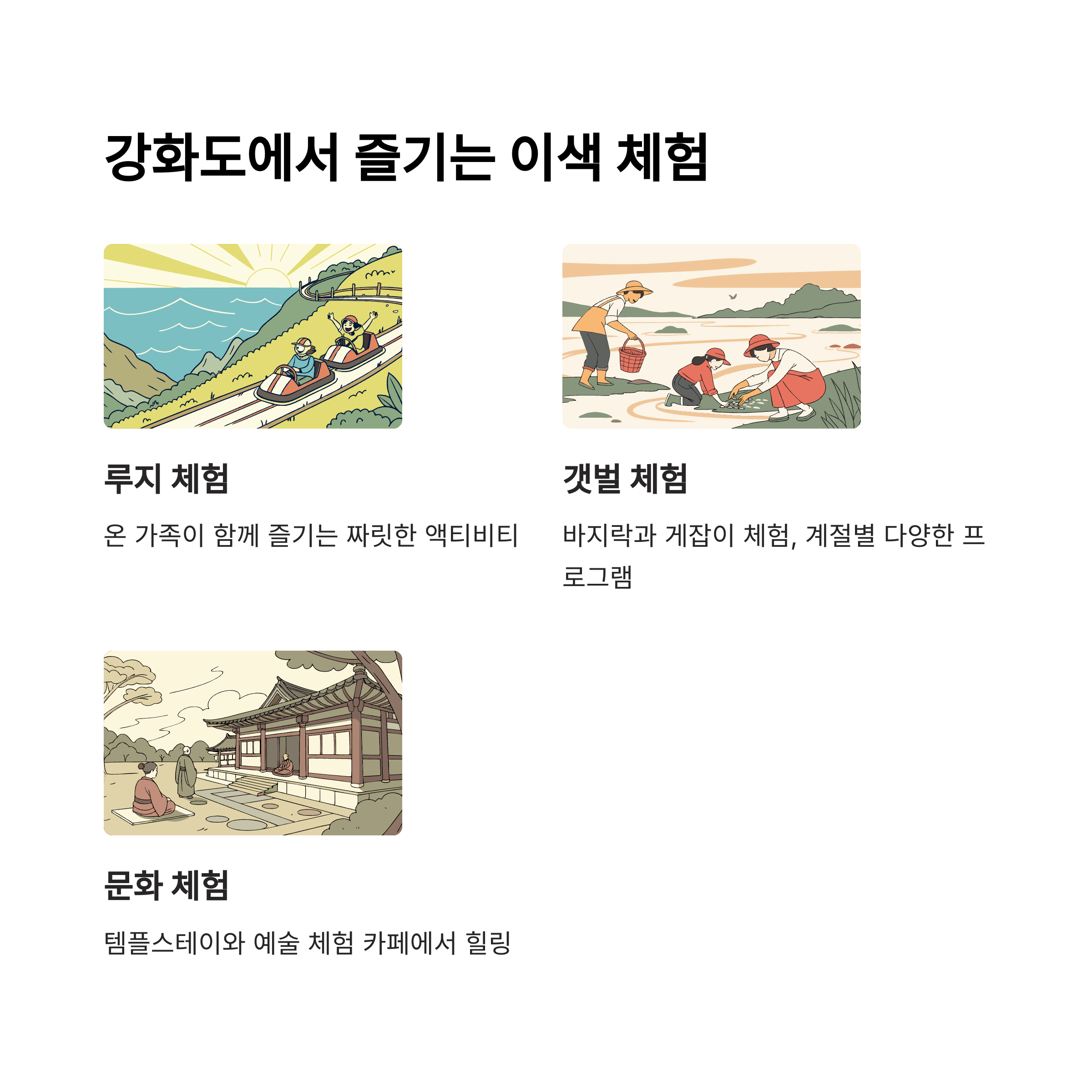 | 강화도 대표 명소 | 마니산, 동막해변, 고인돌 등 다양한 테마의 여행지 |