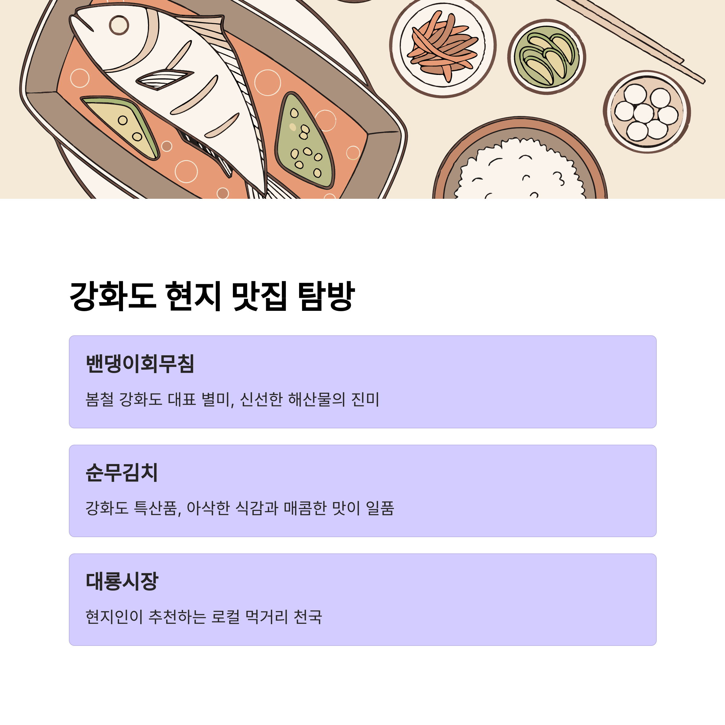 | 마니산, 동막해변, 전등사 등 | 오션뷰 해안도로 + 석모대교 코스 | 밴댕이회무침, 강화순무김치 등 특색음식 |