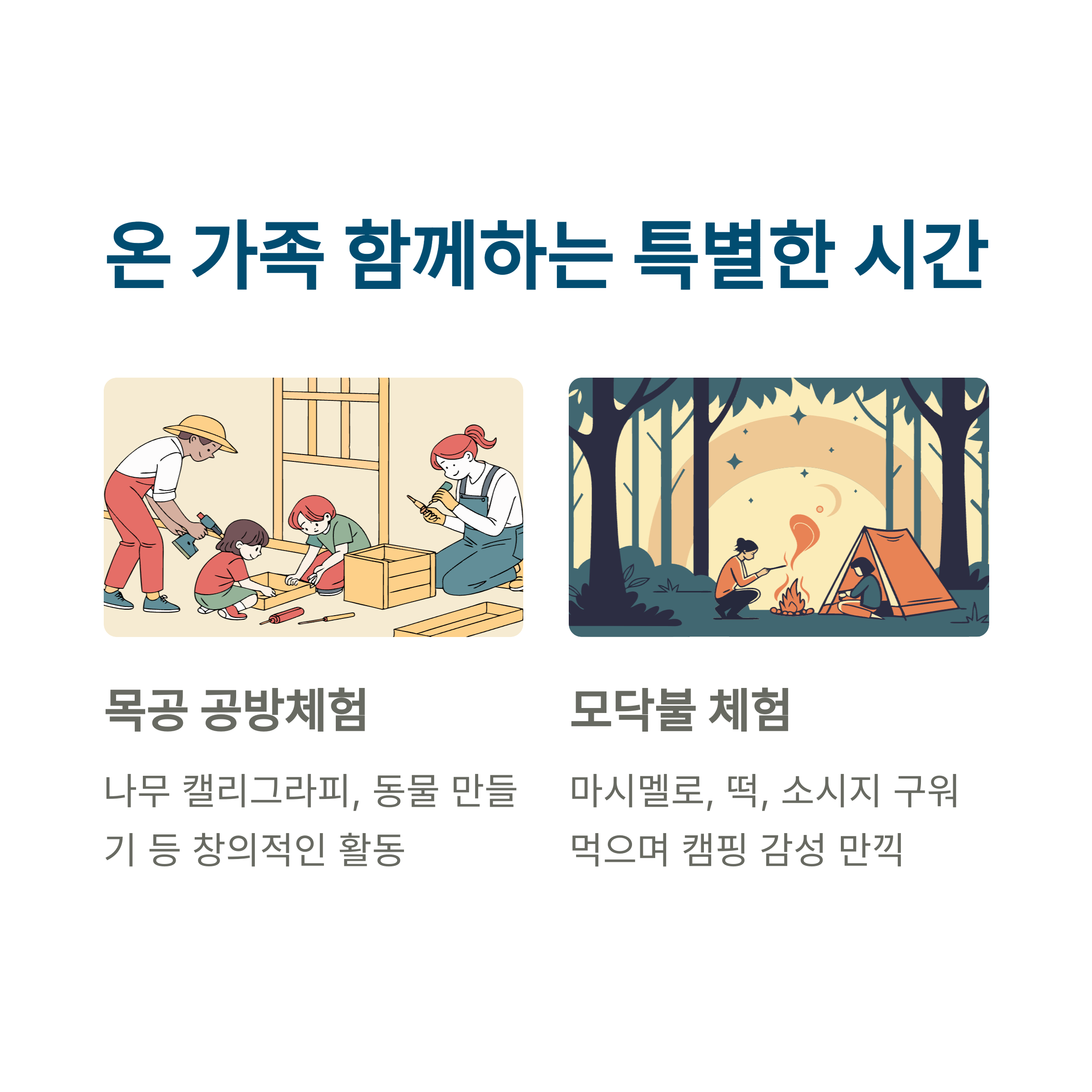 | 공방 & 모닥불 체험 | 목공예, 불멍, 마시멜로우 구이 등 가족 체험 프로그램 제공 |