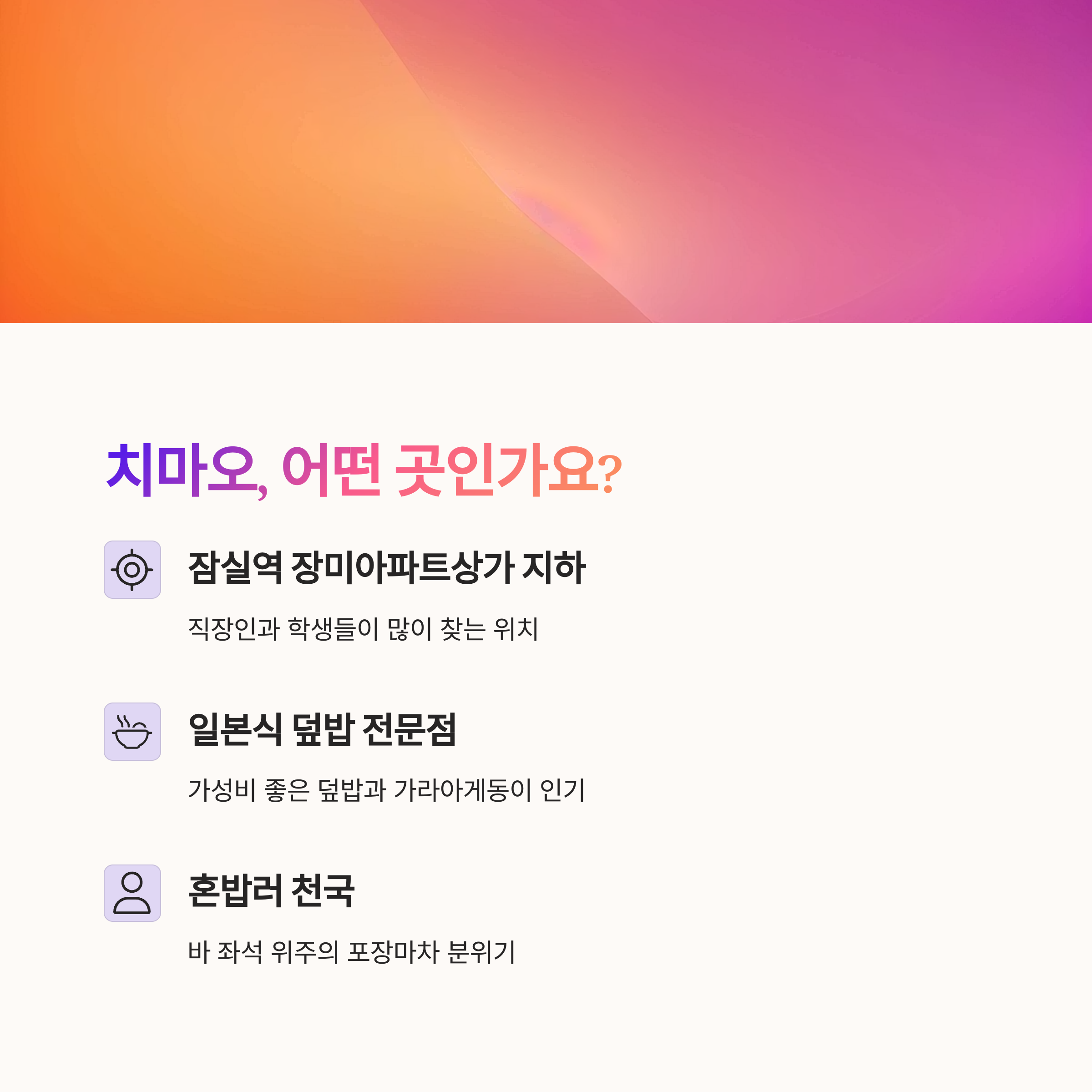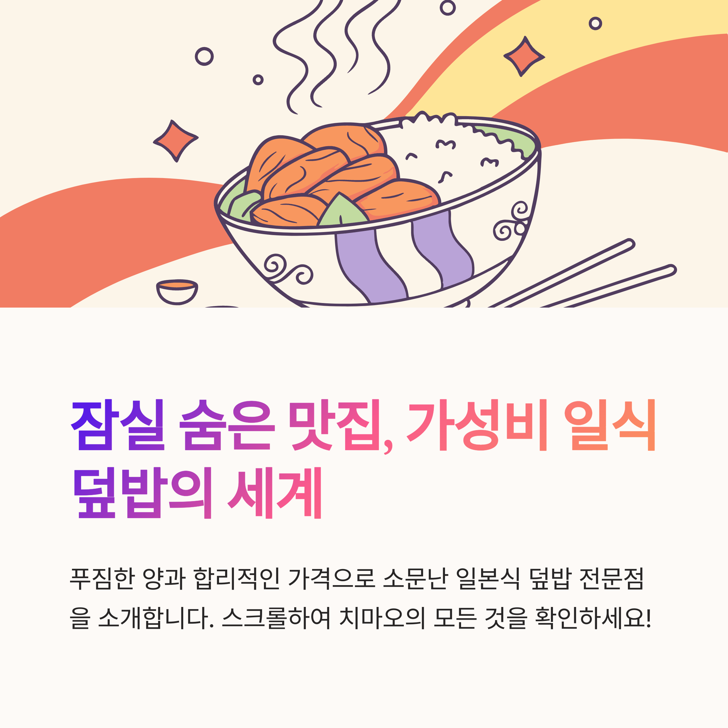 직장인과 학생들이 많이 모이는 잠실역 근처, 장미아파트상가 지하에 위치한 '치마오'는 가성비 좋은 일본식 덮밥과 가라아게동으로 입소문을 탄 소규모 식당입니다. 바 좌석 위주의 포장마차 분위기에서 즐기는 푸짐한 한 끼가 매력적인 이곳은 혼밥러에게 특히 추천되는 공간입니다.