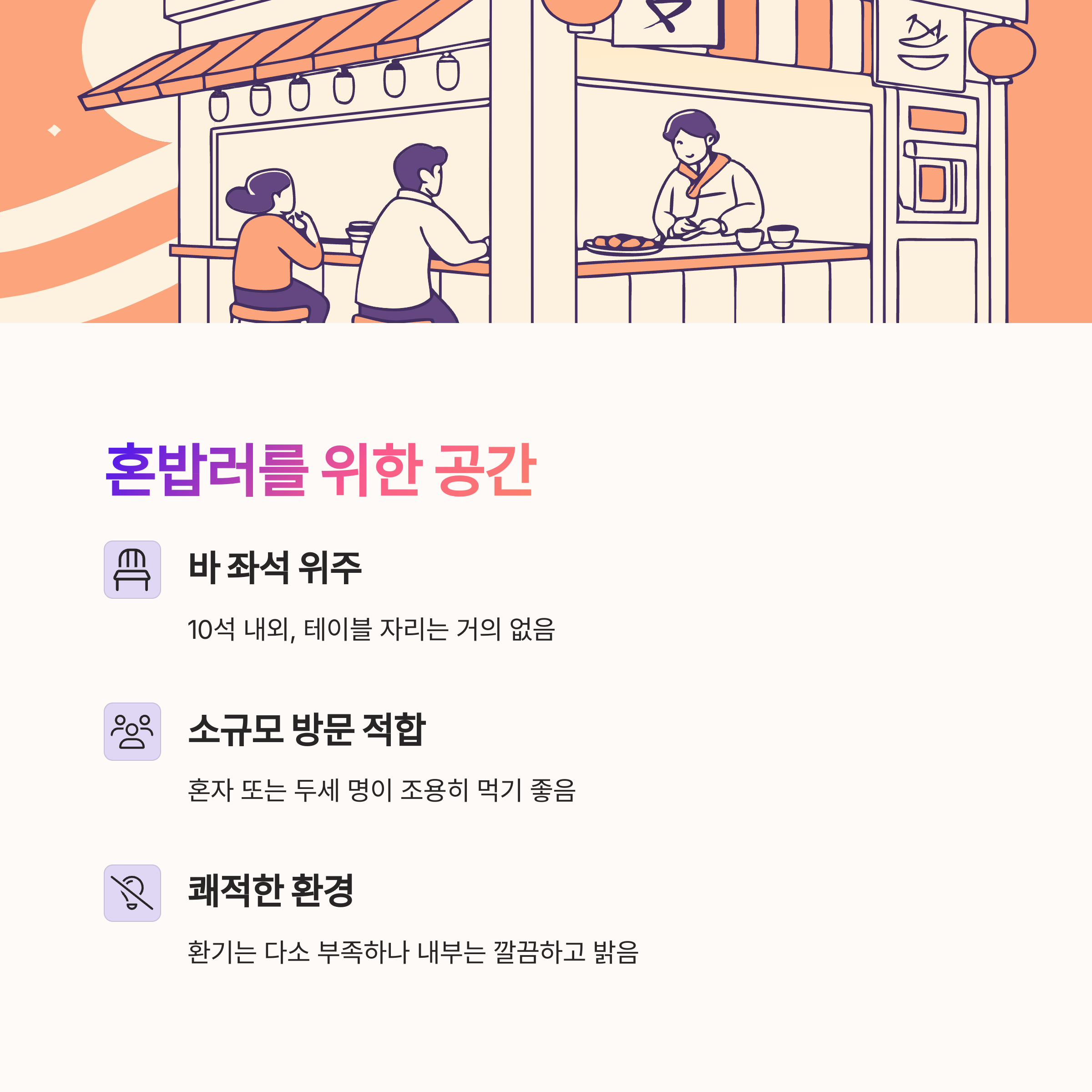 매장 규모는 바 좌석 위주로 10석 내외이며, 테이블 자리는 거의 없습니다. 혼자 방문해 빠르게 식사하거나 두세 명이 조용히 먹기에 적당한 공간입니다. 환기는 다소 부족하지만 내부는 깔끔하고 조도가 밝아 쾌적합니다.
