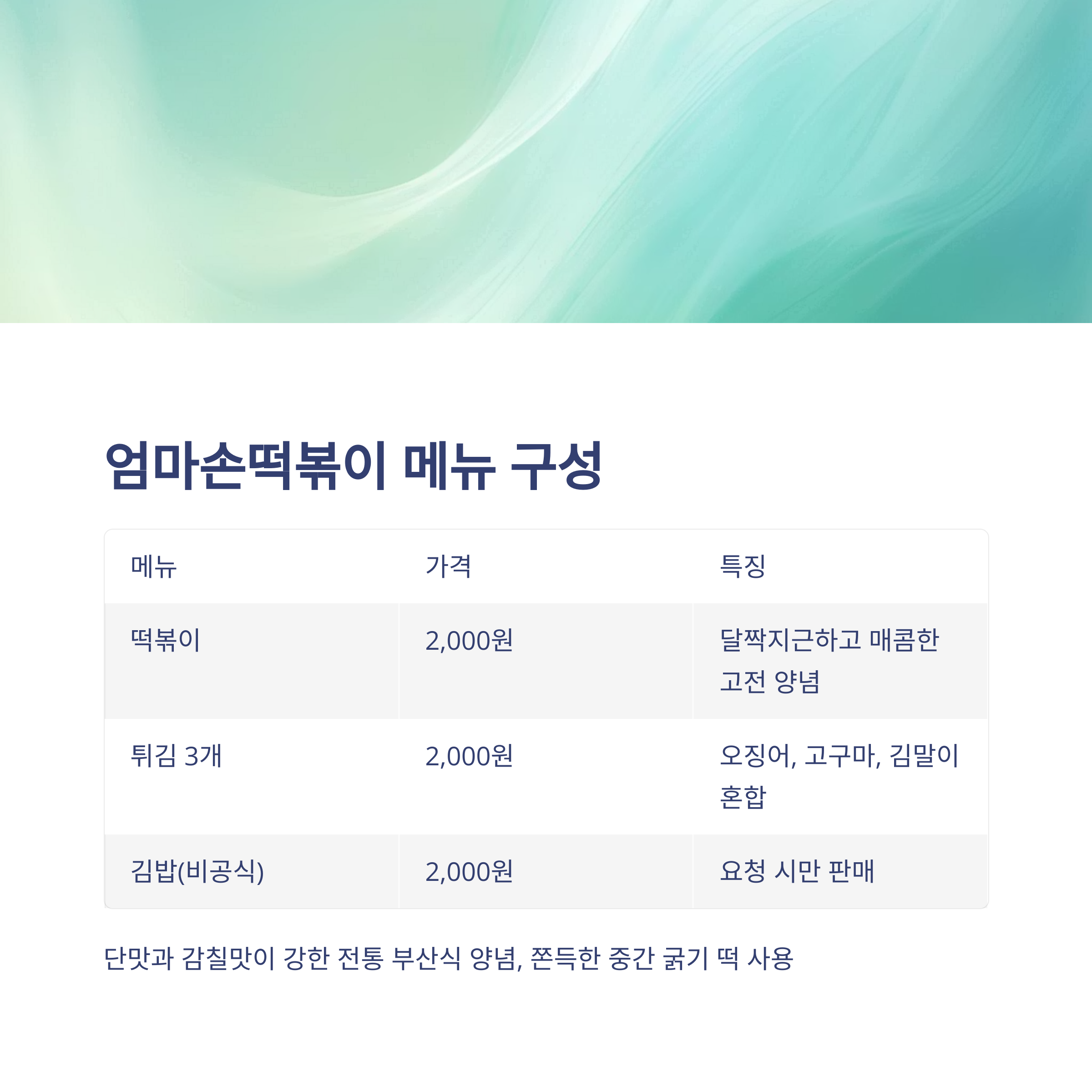 ‘엄마손떡볶이’는 단돈 4,000원으로 떡볶이와 튀김 한 세트를 즐길 수 있는 극강의 가성비를 자랑하며, 진한 양념의 깊은 맛과 정겨운 분위기로 부산 분식 문화를 대변합니다. 관광객은 물론, 부산 시민들에게도 여전히 회귀본능을 자극하는 맛집으로 추천할 만합니다.