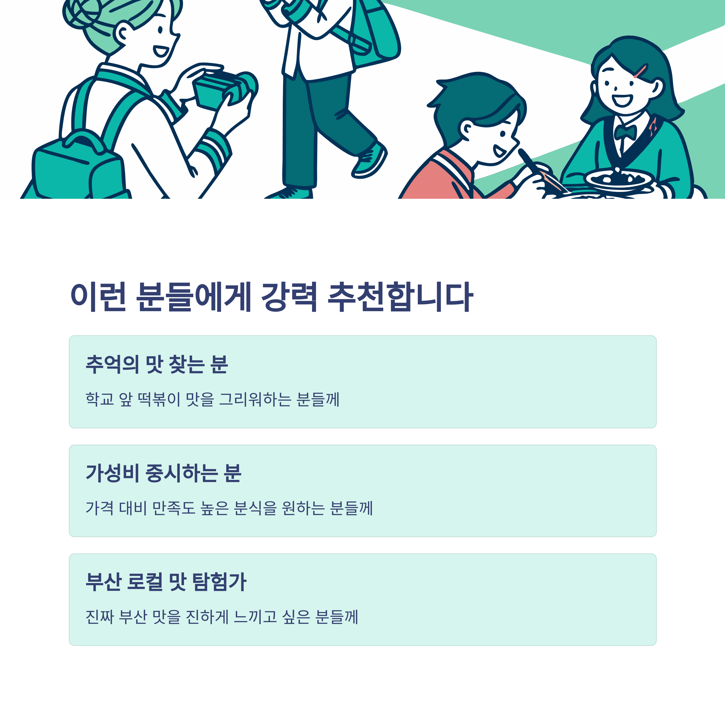 부산 현지 대학생들과 인근 직장인 사이에서는 "여기 떡볶이 먹으면 프랜차이즈 못 간다"는 반응이 많으며, 튀김과의 조합이 최고라는 평가가 압도적입니다.