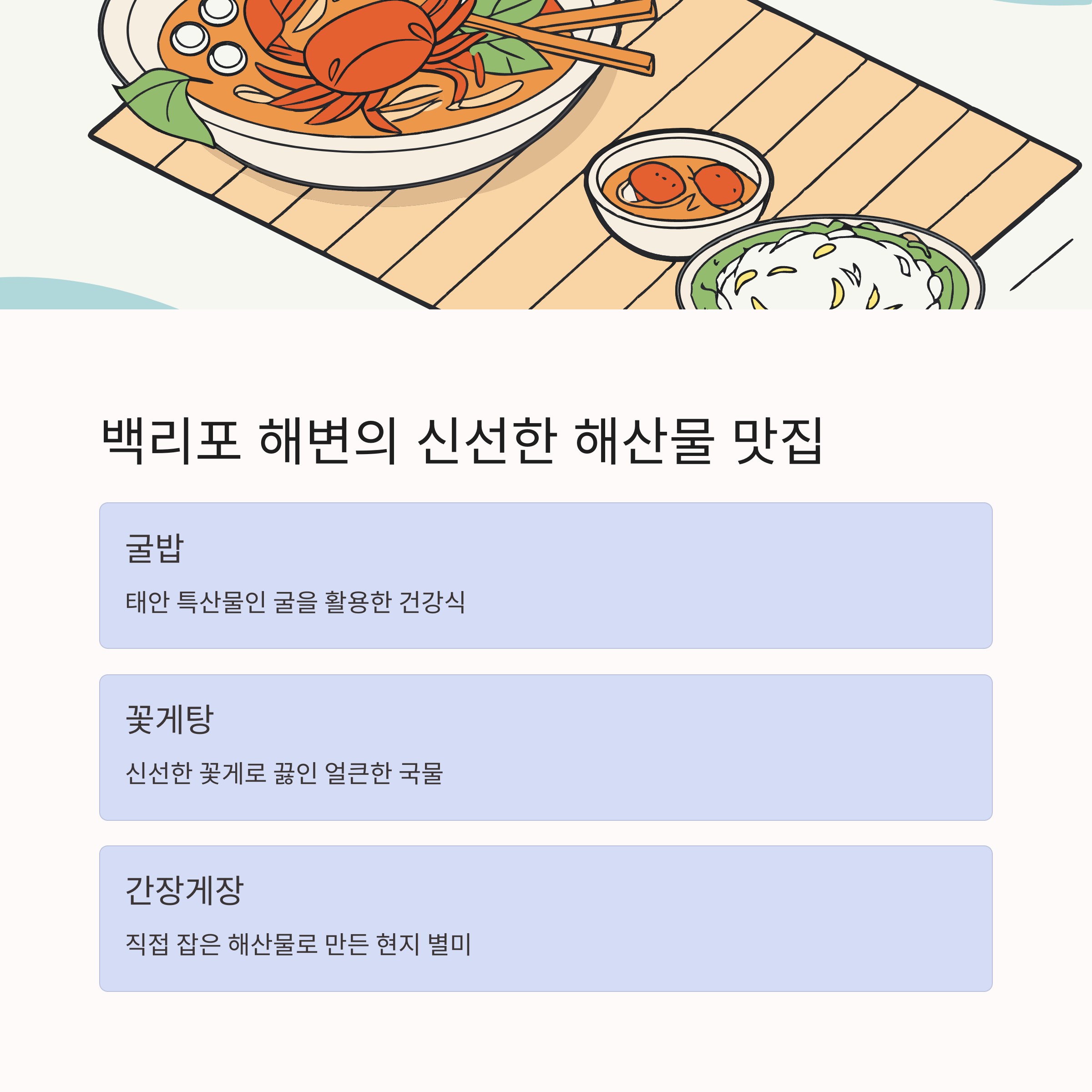 굴밥, 꽃게탕, 간장게장 등 해산물 가득한 식사가 여행의 즐거움을 더해줍니다.