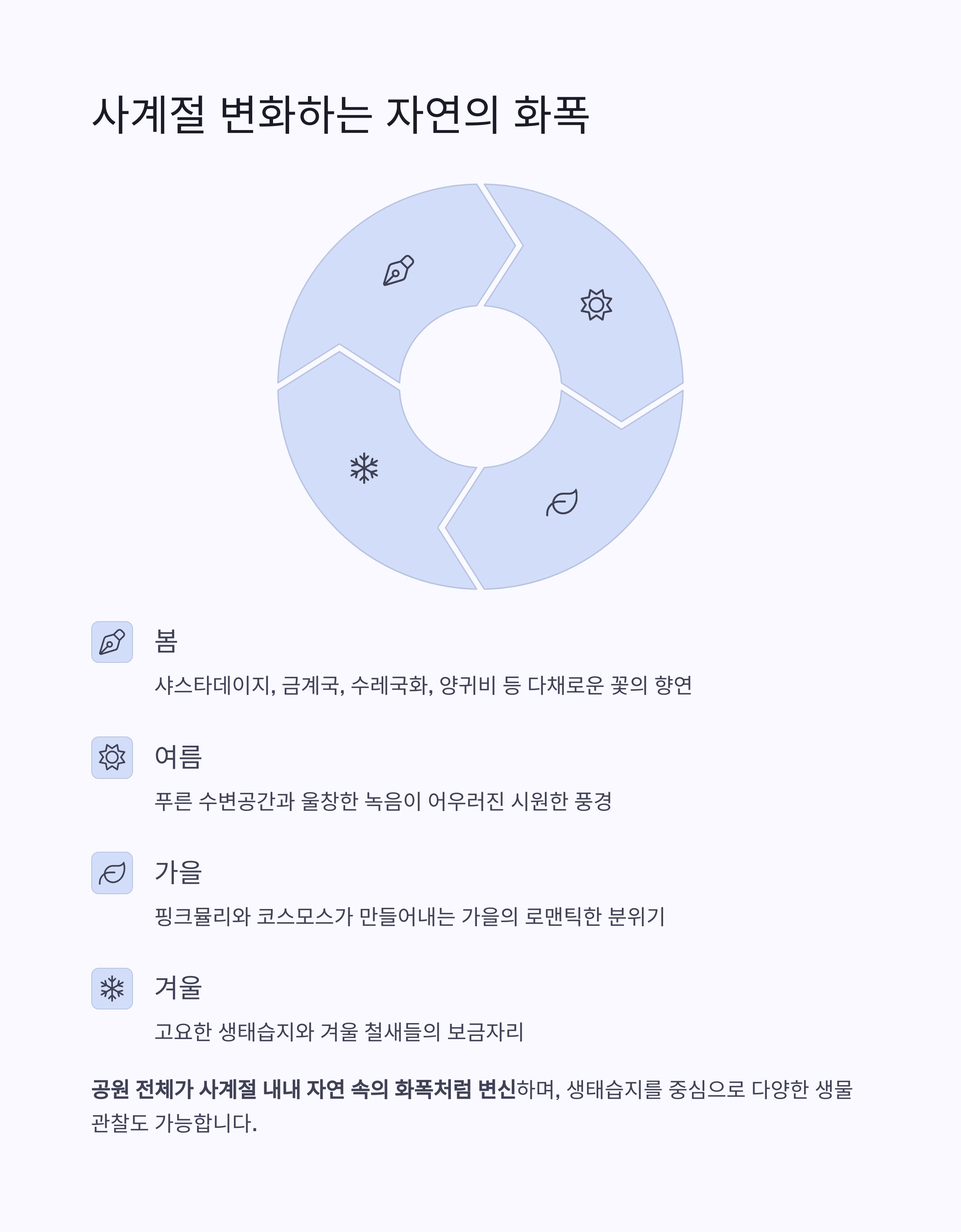 공원 전체가 사계절 내내 자연 속의 화폭처럼 변신하며, 생태습지를 중심으로 다양한 생물 관찰도 가능합니다.