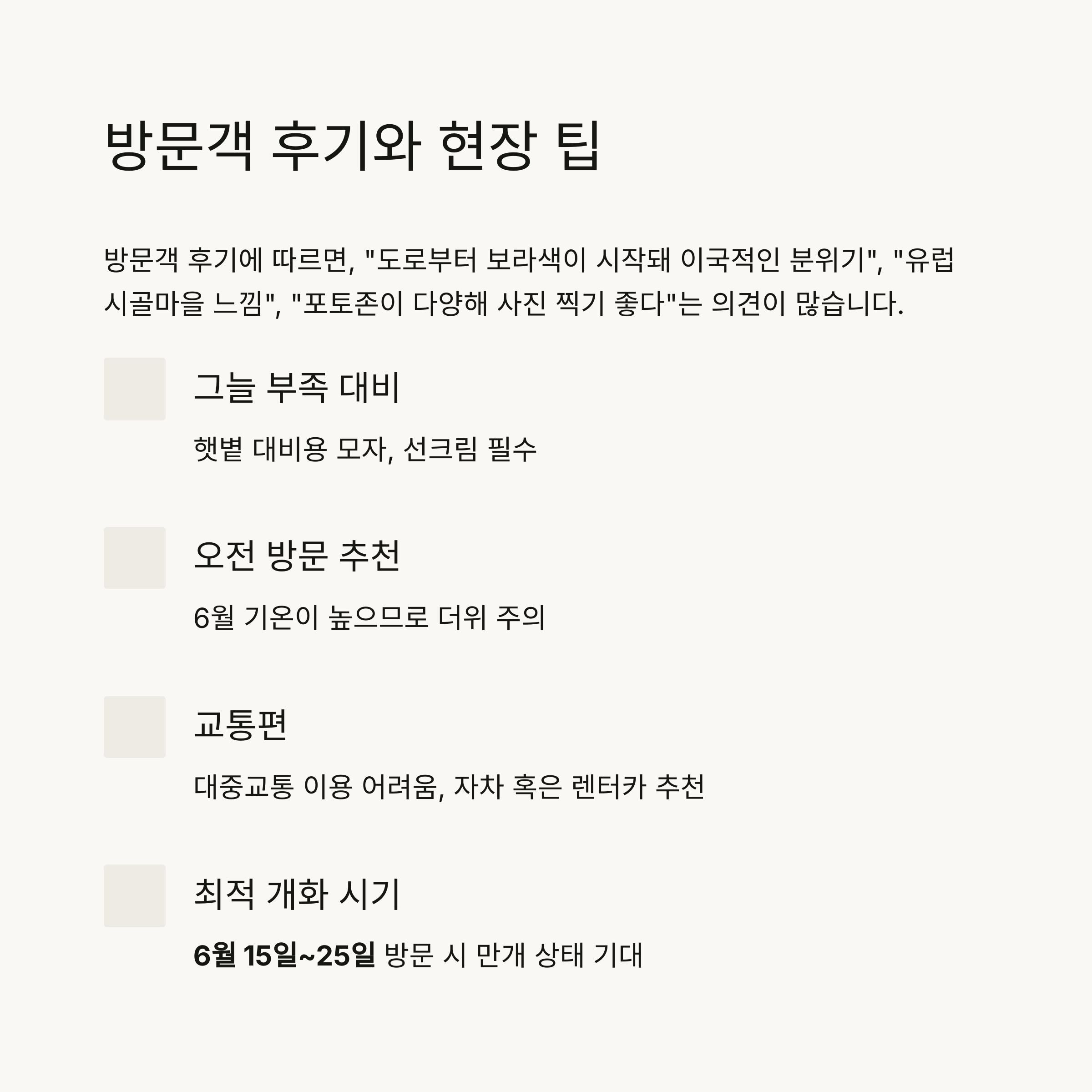 | 개화 시기 | 6월 15일~25일 방문 시 만개 상태 기대 가능 |