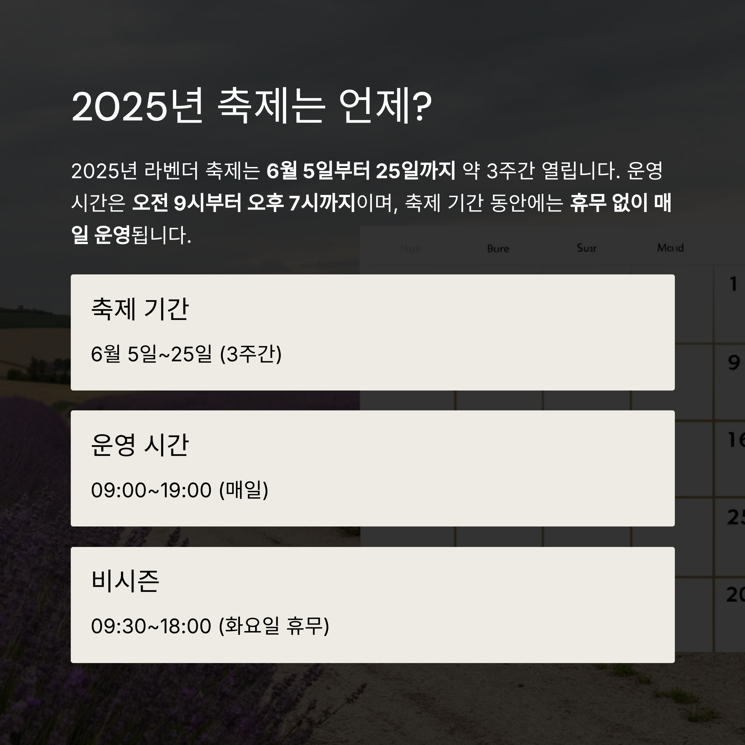 2025년 라벤더 축제는 6월 5일부터 25일까지 약 3주간 열립니다.