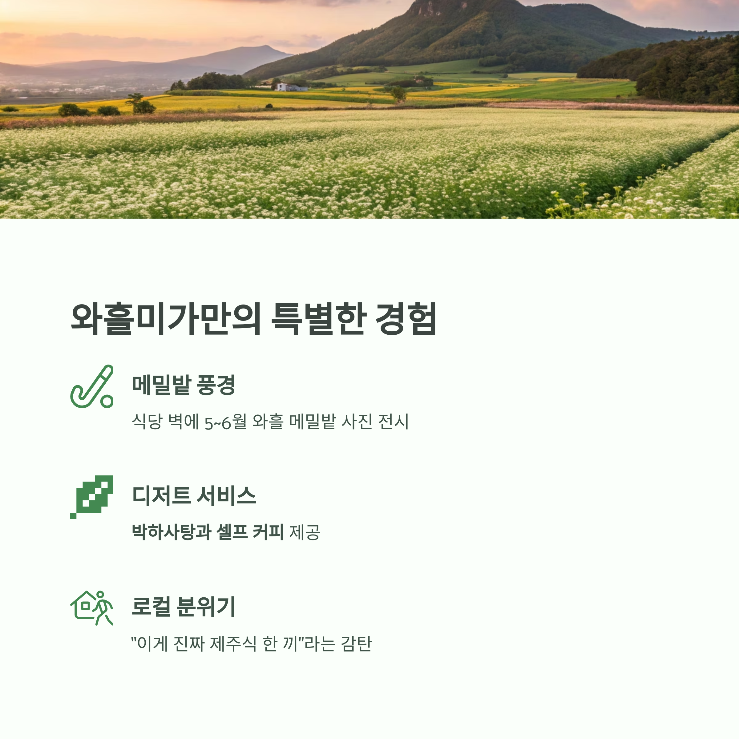 | 메밀국수(여름 한정) | 8,000원 | 와흘 메밀 활용 시원한 맛 |