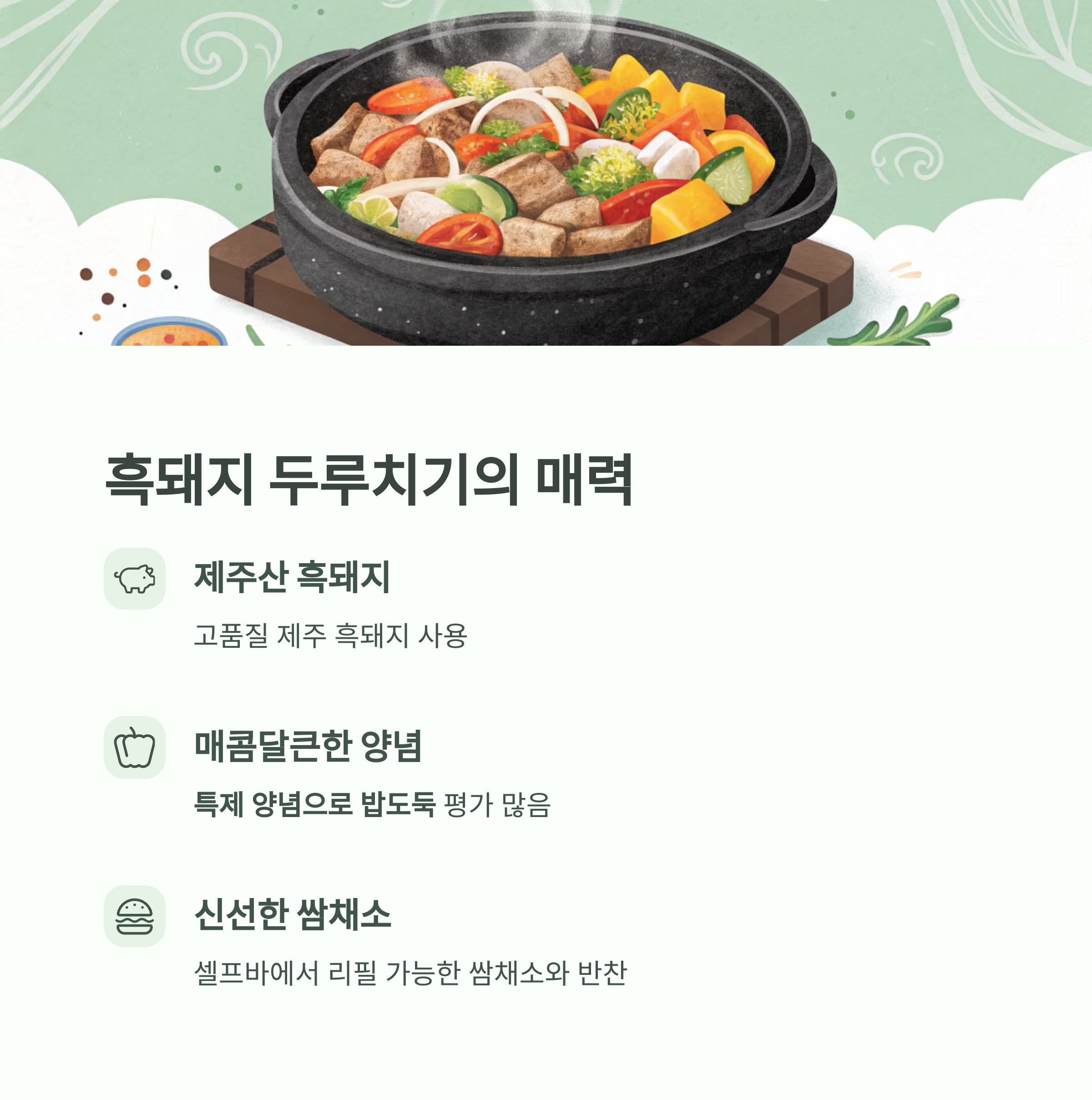 | 흑돼지 두루치기 | 13,000~15,000원 | 고기+야채 볶음+쌈채소 |