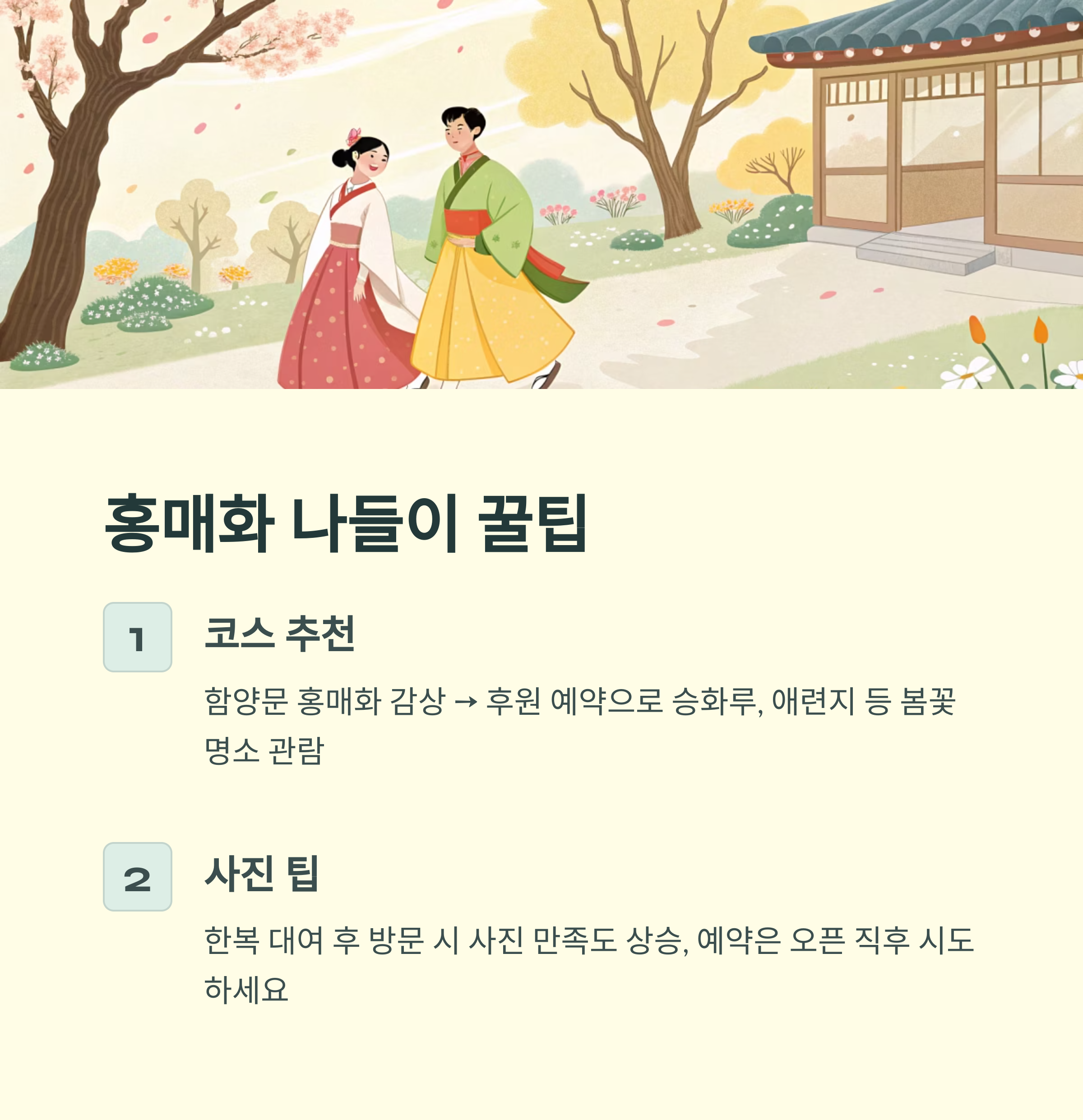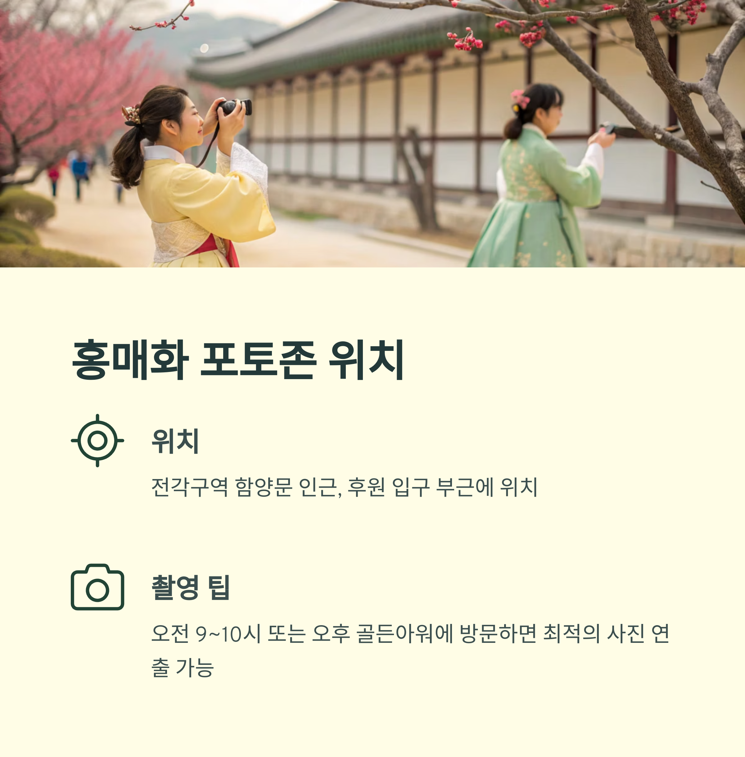 - 전각구역(함양문)에서 홍매화 감상 → 후원 예약 시 승화루, 애련지 등 봄꽃 명소도 함께 관람