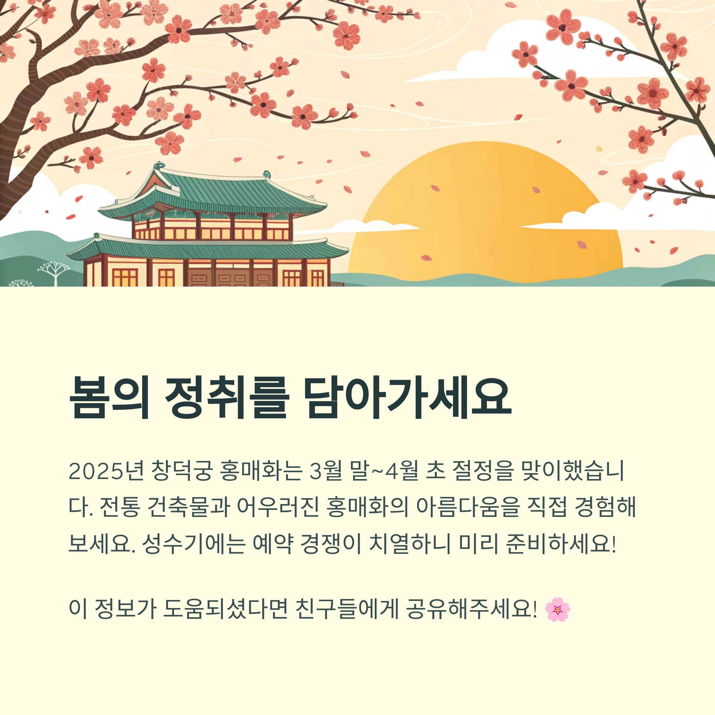2025년 창덕궁 홍매화는 3월 말~4월 초 절정을 맞으며 방문객들에게 특별한 봄 풍경을 선사했습니다. 홍매화와 전통 건축물이 어우러진 포토존, 감각적인 사진 촬영 팁, 후원 예약 방법까지 꼼꼼히 준비해 더욱 즐거운 궁궐 나들이를 경험해 보세요. 성수기에는 예약 경쟁이 치열하니 미리 준비하시길 권장합니다!