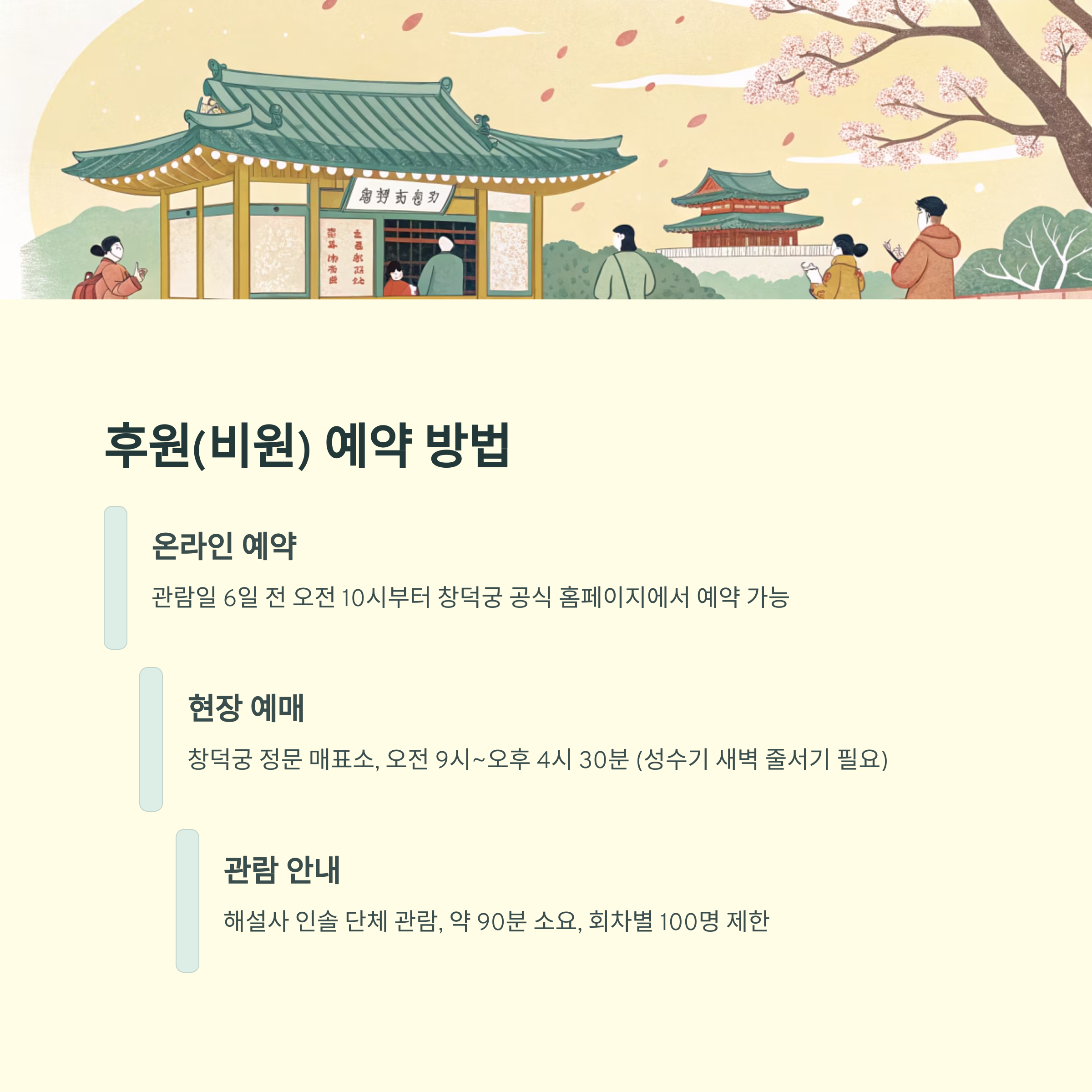 후원 관람은 사전 예약제이며, 온라인 또는 현장 예매가 가능합니다. 성수기에는 경쟁이 치열하므로 온라인 예약을 권장합니다.