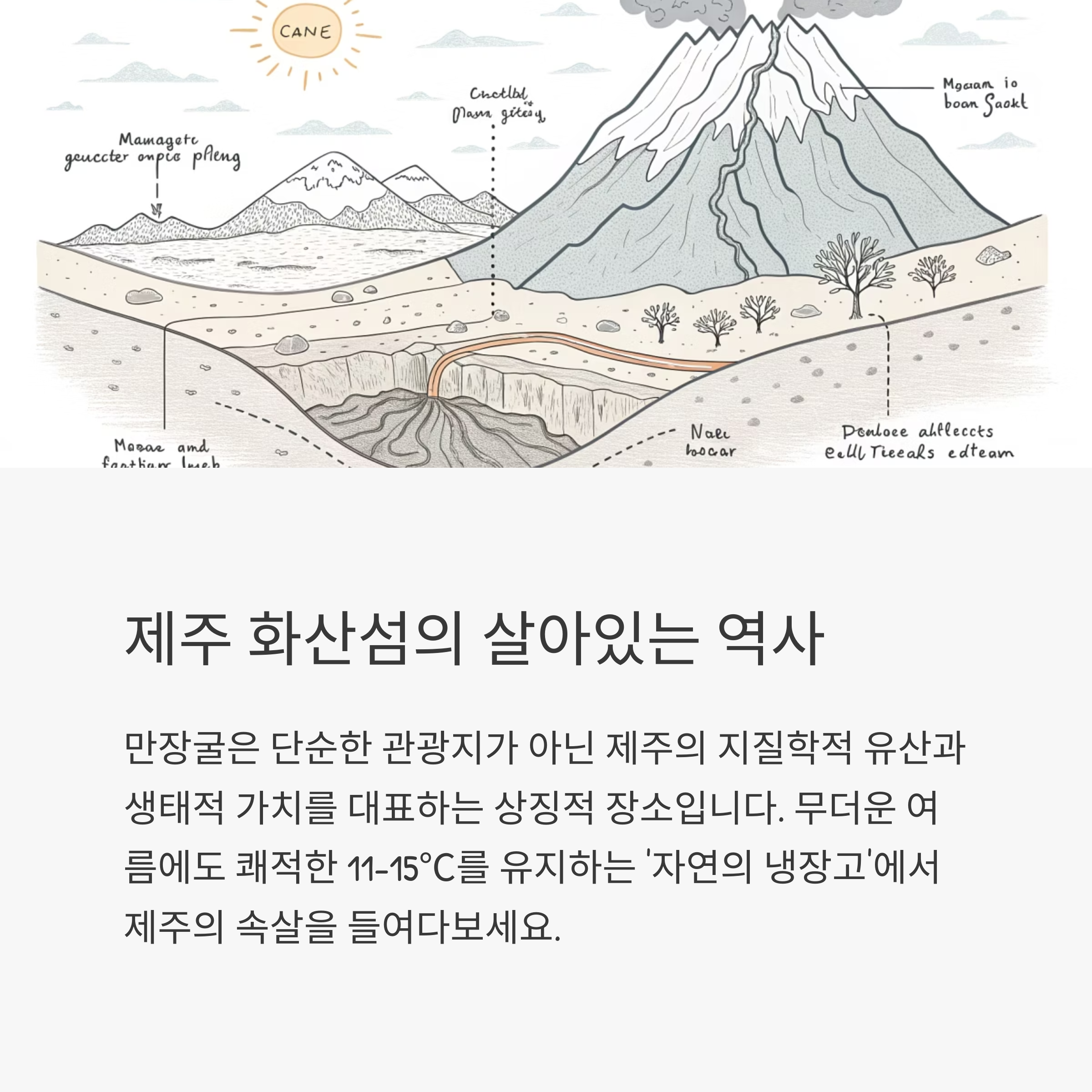 제주 여행을 계획하는 많은 사람들이 흔히 바다와 오름을 떠올리지만, 제주 땅속 깊은 곳에 숨겨진 경이로운 세계를 알고 있는 사람은 많지 않습니다. 바로 제주시 구좌읍에 위치한 만장굴이 그 주인공입니다. 이 용암동굴은 약 10만~30만 년 전 형성된 거문오름 화산의 용암 흐름이 빚어낸 자연의 걸작으로, 세계에서 손꼽히는 규모와 학술적 가치를 지니고 있습니다. 무더운 여름에도 11~15도의 시원한 온도를 유지하는 만장굴은 ‘자연이 만든 천연 냉장고’라 불릴 만큼 특별한 체험을 선사합니다. 여행자가 만장굴에 발을 디딘 순간, 수십만 년 세월이 만들어낸 지하 세계의 신비로움에 빠져들게 될 것입니다.